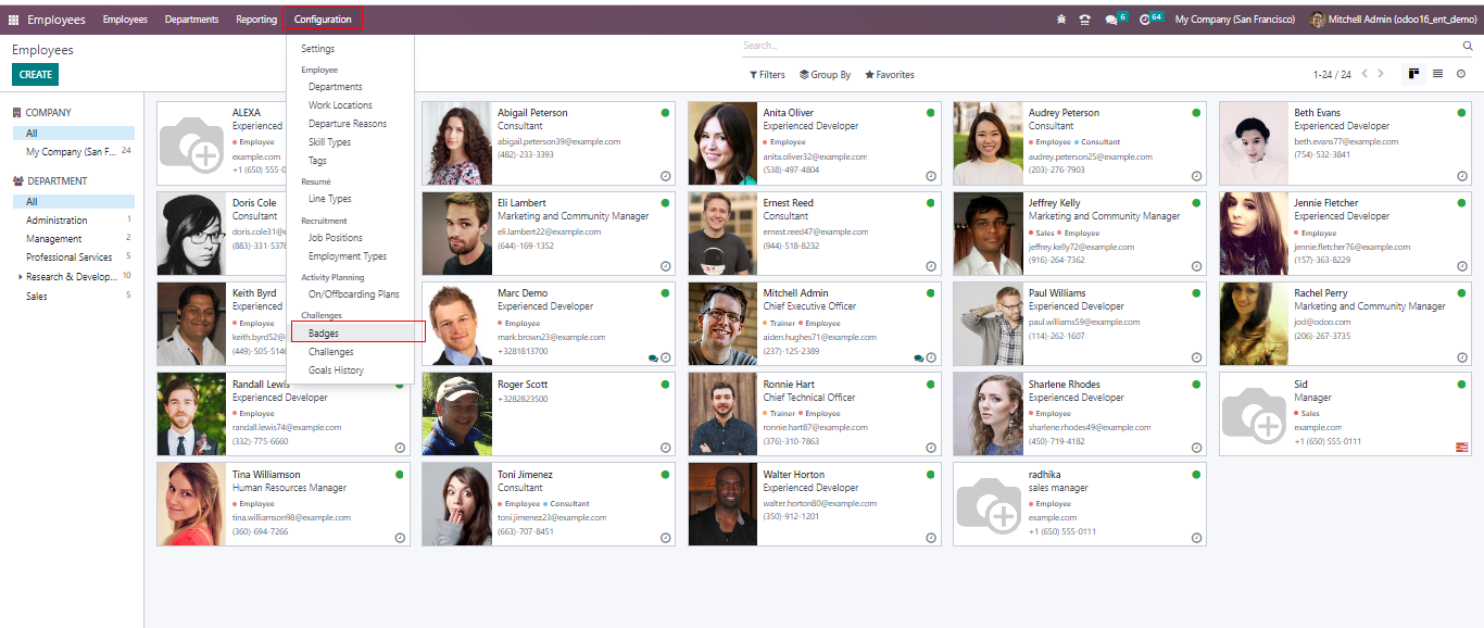 Within the Odoo 16 Employees Module , Employee Challenges and Badges serve distinct purposes aimed at motivating employees through diverse appreciation initiatives and tasks.