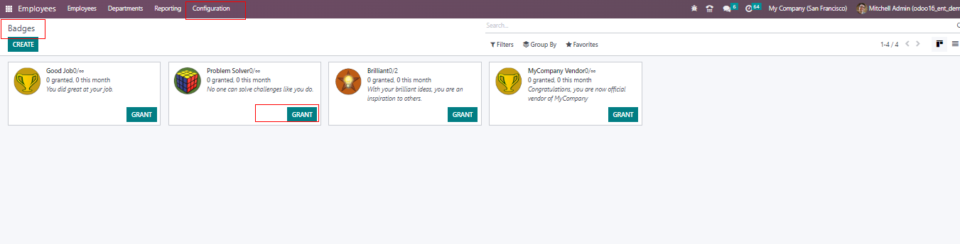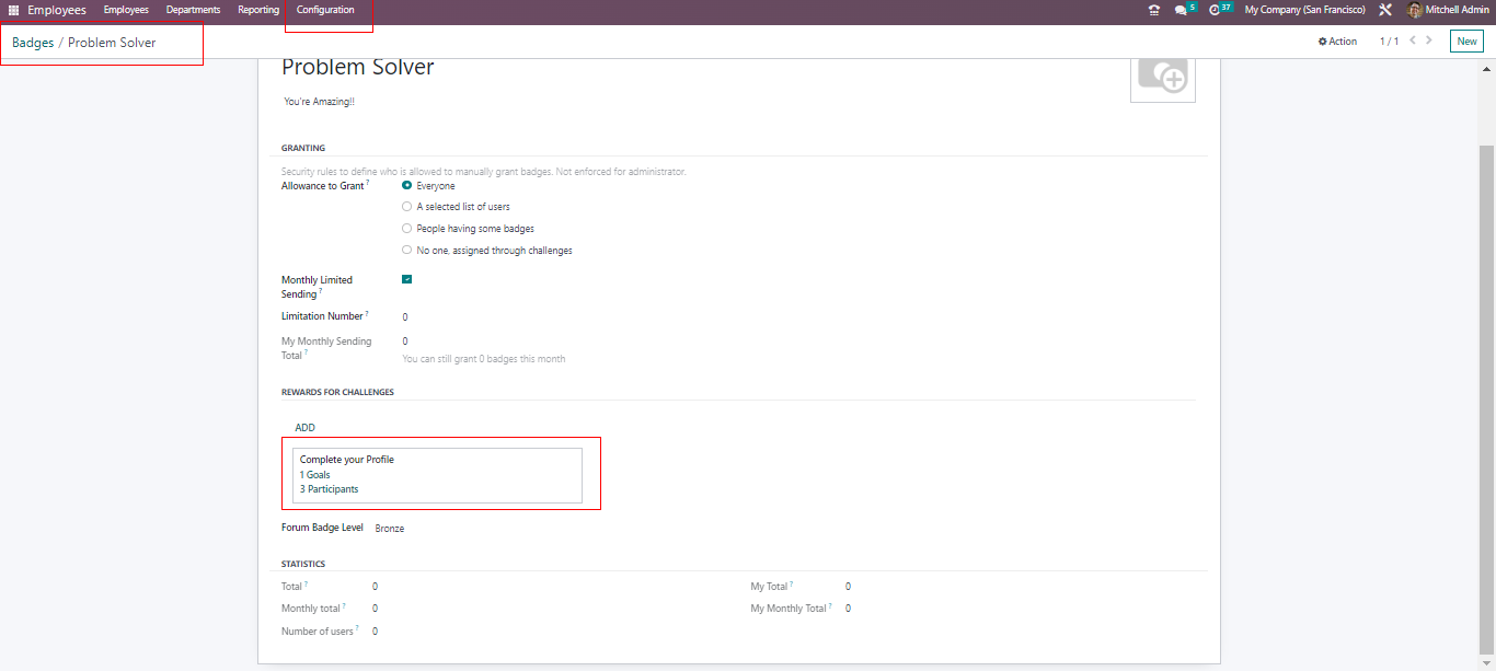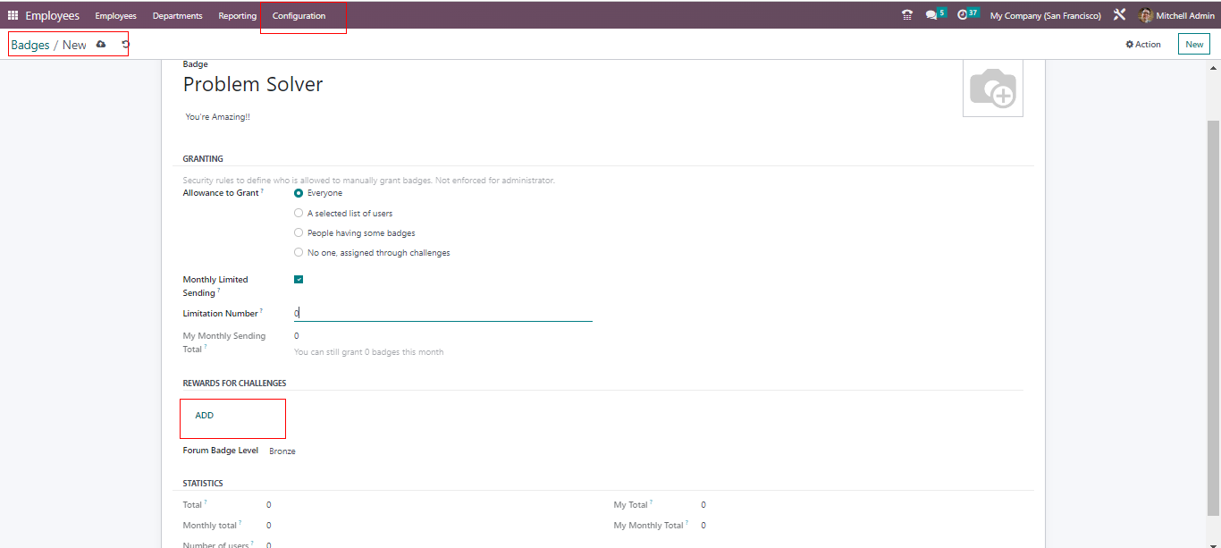 Your account encompasses a wealth of information, encompassing the “Total” count of times this badge has been bestowed, the “Monthly Total,” the “Number of users,” “My Totals,” and “My Monthly Total.” Pertinent statistics concerning this badge are readily visible within the “STATISTICS” section. This is how badges can be configured within the Odoo Employees module. As demonstrated in the following depiction, the recently crafted badge becomes evident within the dashboard of the “Badges” homepage.