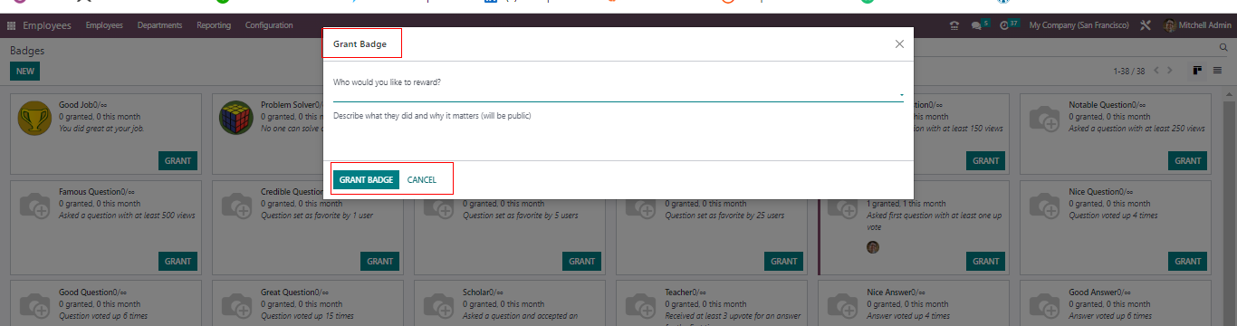 In this section, you’ll notice the badge name, the overall count of badges that have been awarded, and a description outlining the badge’s qualification criteria. These details are visibly displayed on each Kanban Card. Notably, an actionable “GRANT” button is featured on every Kanban Card, facilitating administrative users in awarding badges to eligible employees. By clicking the “GRANT” button, a popup window is triggered, as depicted in the image below.
