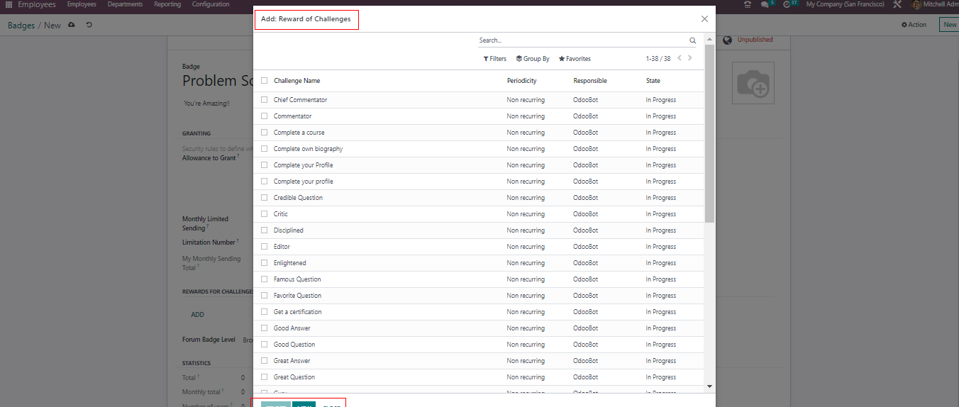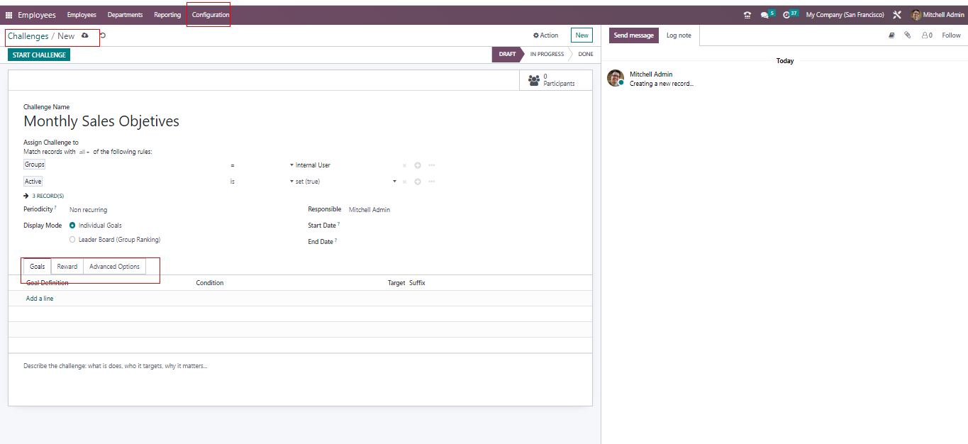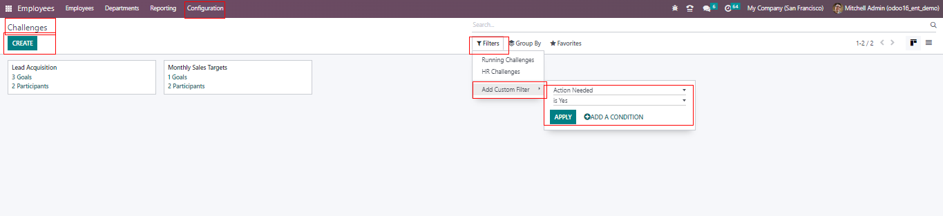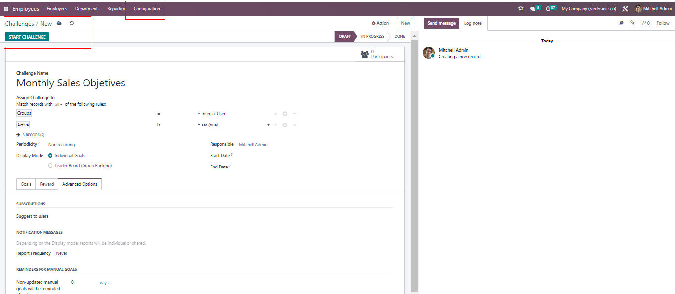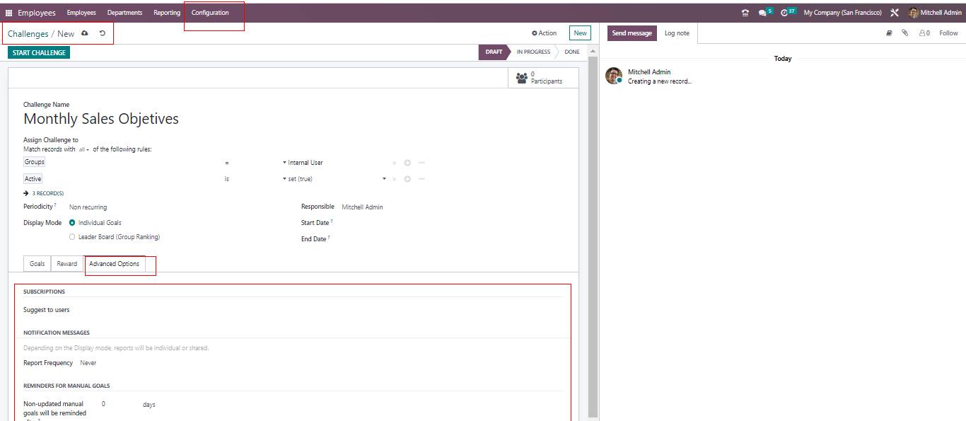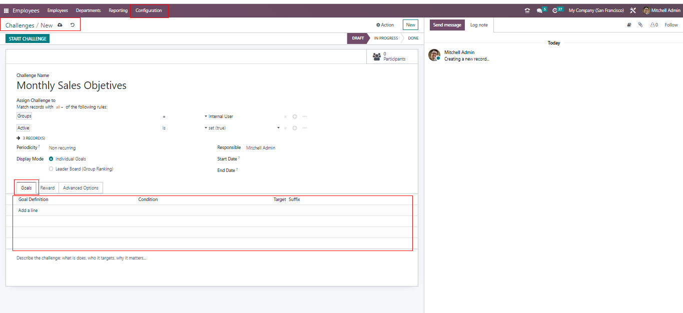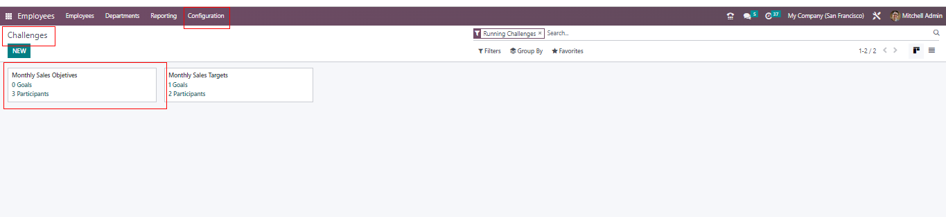 Having covered the badge feature within the Odoo 16 Employees Module , let’s now delve into the process of establishing and overseeing the Challenges functionality.