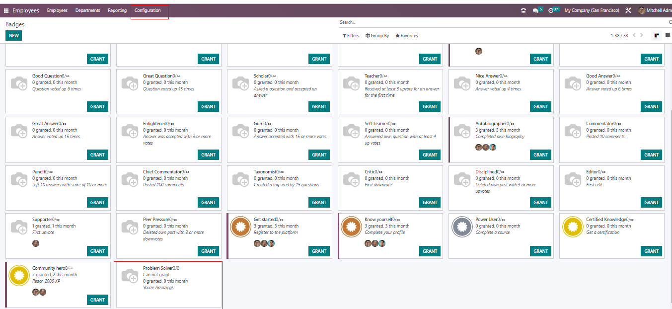 Once you’ve chosen the “Badges” option from the dropdown list in the “Configuration” menu, you’ll be directed to the “Badges” Homepage. Here, you’ll find a dashboard view presenting the badges that have been previously established, arranged in a Kanban style. This layout is evident in the screenshot provided below.