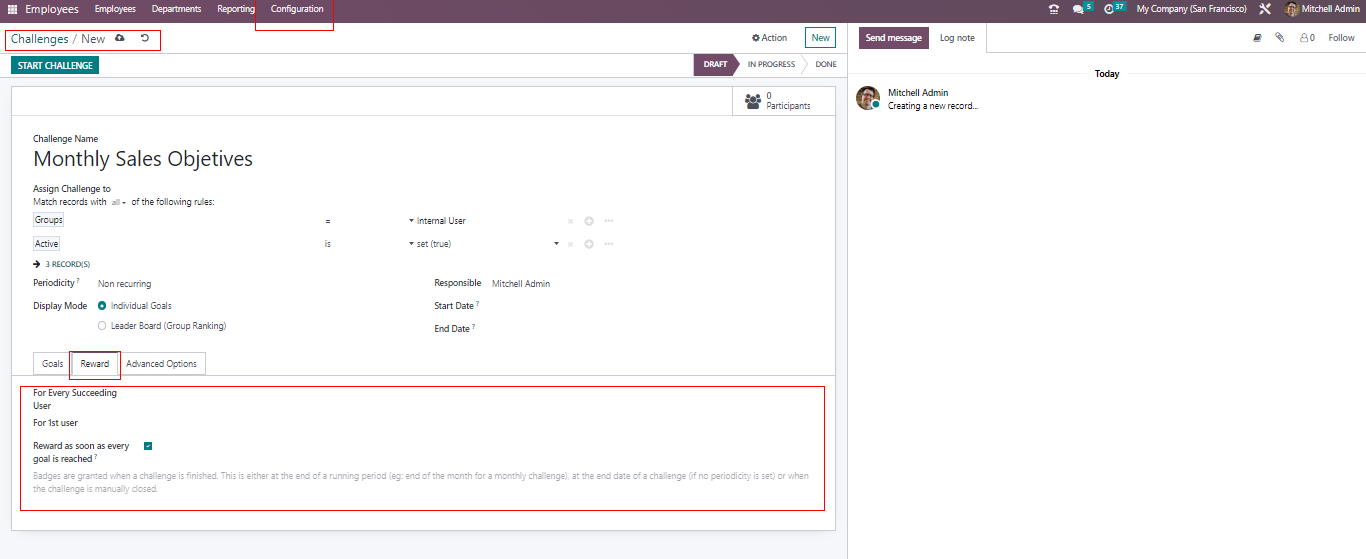 In the form , navigate to the Challenge Name section and input a suitable name for the challenge. Subsequently , you can assign the challenge to an employee to or individual within your organization by specifying their name in the Assigning Changes to field. Odoo facilitates automated challenge assignments using filtering options like Match records , which are accessible within the platform. The periodicity parameter allows you to define the frequency of automated challenge assignment – option encompassing daily , weekly , monthly , or yearly intervals.