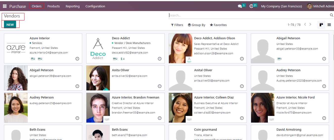 Maintaining good vendor relationships is crucial for effective purchase operations in an organization. Odoo’s Purchase module streamline vendor contact management, enabling quick access to vendor details when needed. With Odoo ERP, configuring and maintaining a vendor list becomes effortless, allowing users to efficiently manage vendors and related operations in one centralized location. Access the vendor management window through the Purchase module’s order menu.