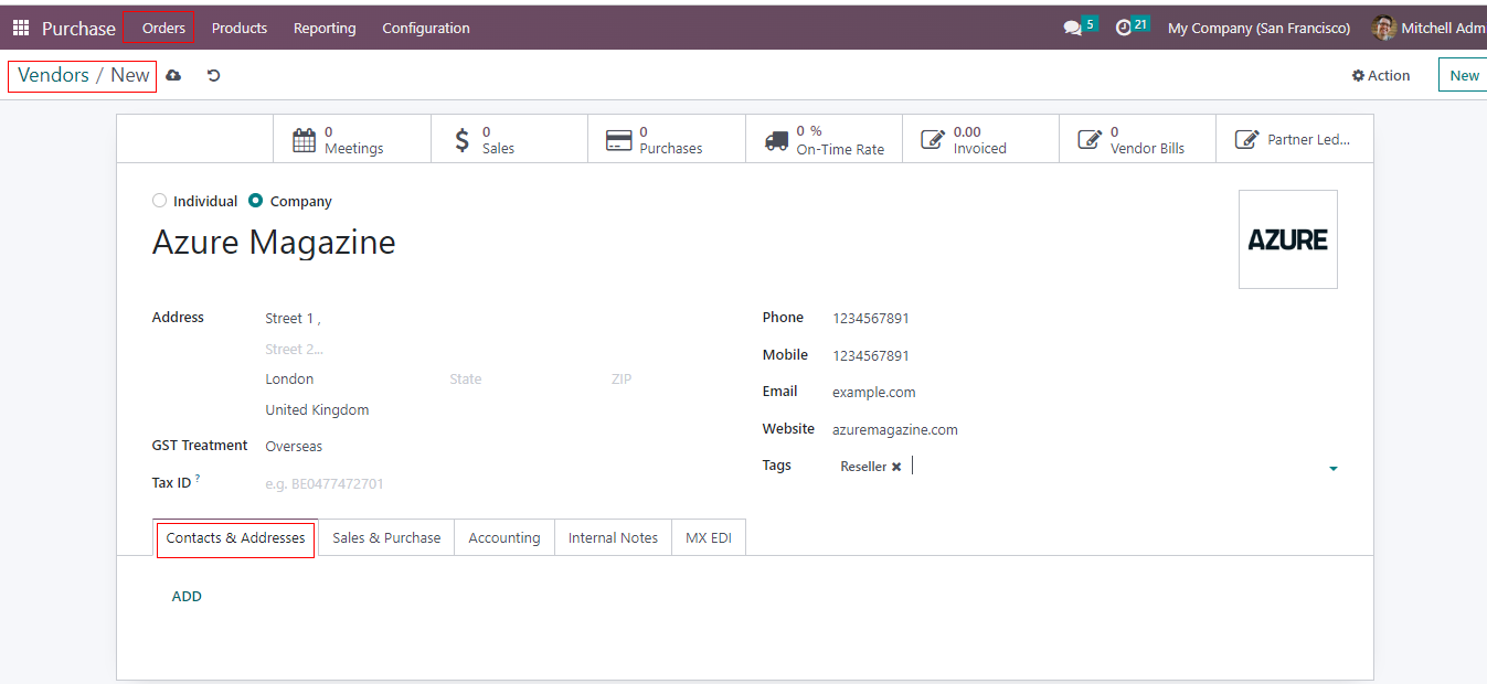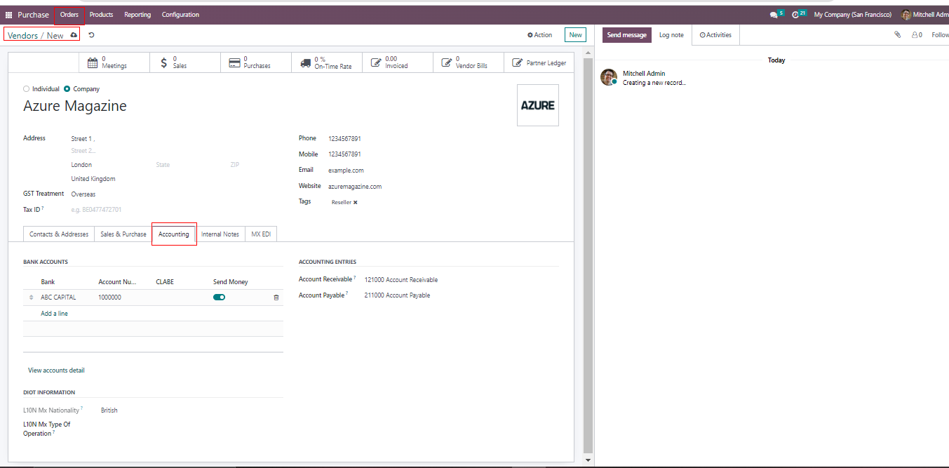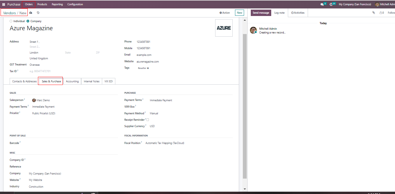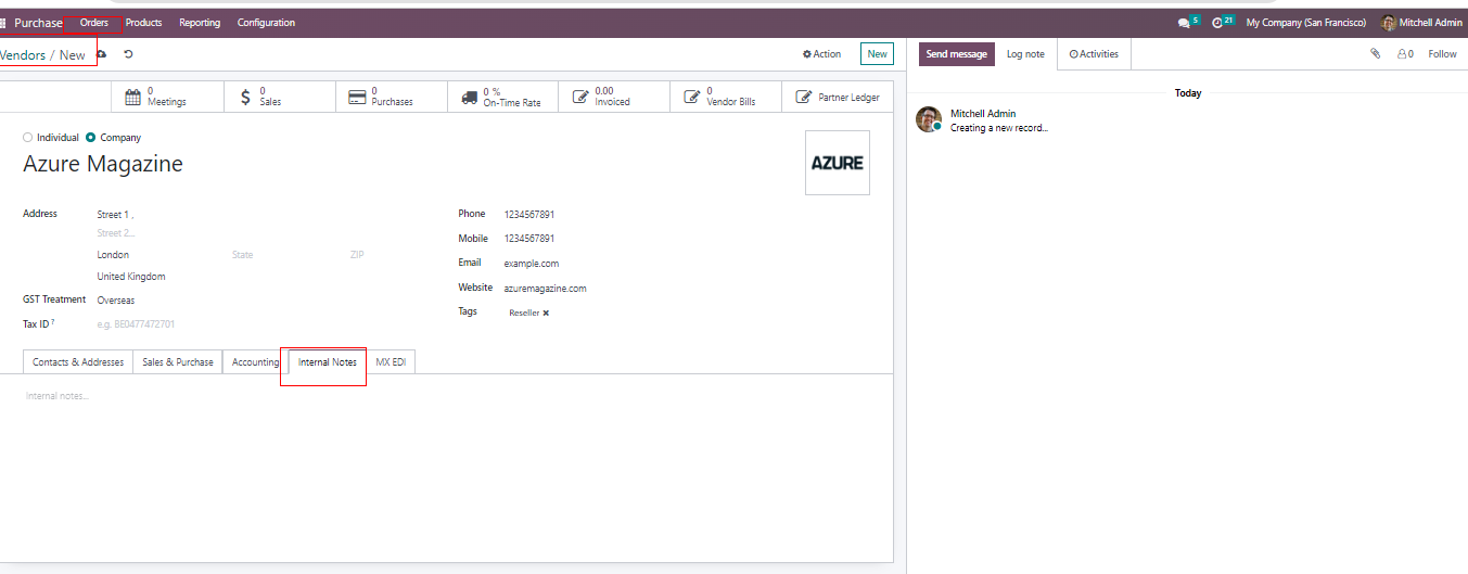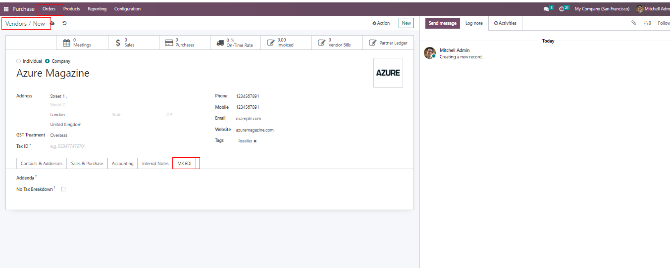 Configuring a new vendor in the Purchase module follows a similar process to configuring a new customer in the Sales module.complete the necessary tabs, such as contacts and Addresses, sales and purchases, Accounting, Internal Notes,and MX EDI.