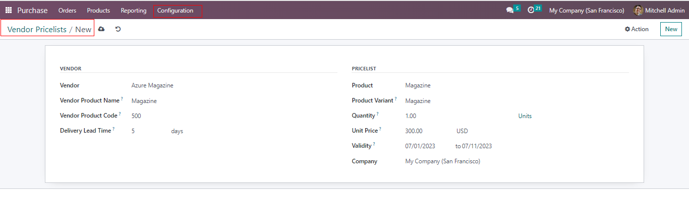 Pricelist are essential for successful and profitable sales operations. Vendor pricelist in the Purchase module allow you to define prices for specific vendors, product, and time periods.These pricelists are applied when purchasing products from vendors.creating vendor pricelist is a process in the Purchase module’s configuration menu.
