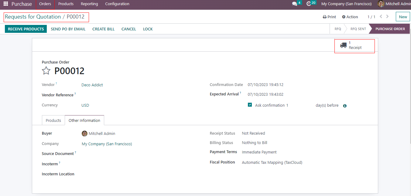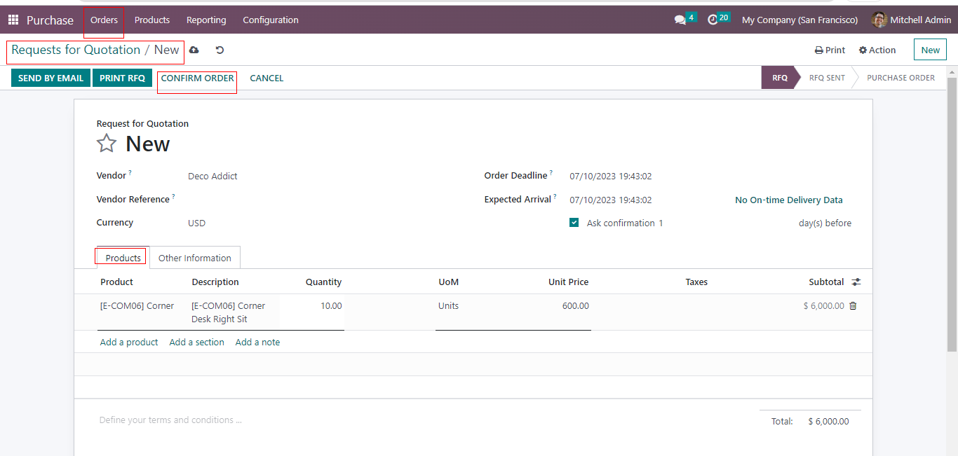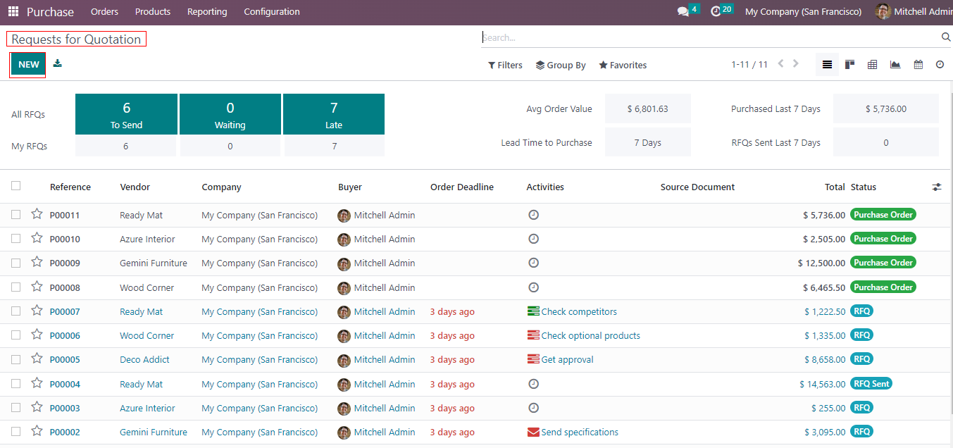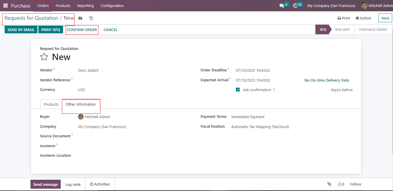 You can then send RFQs to vendors via email. The RFQs can also be printed and saved for further references .Once you receive the quotations from vendors and confirm the purchase order , you can update the status of the RFQs to reflect the conversation to a purchase order.