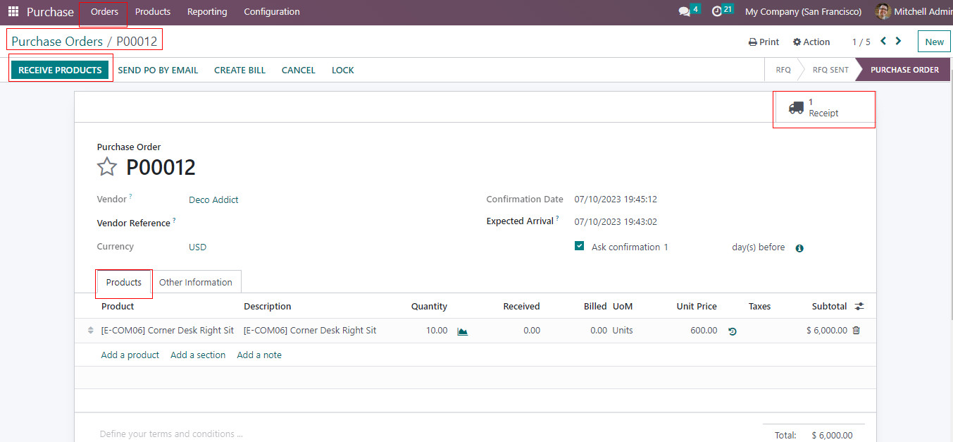 When the vendor sends products as per the confirmed purchase order,Odoo simplifies the receipt process.clicking the Receive Products button opens a window displaying the incoming shipments.Access this window via the Receipt smart button in the purchase order window.