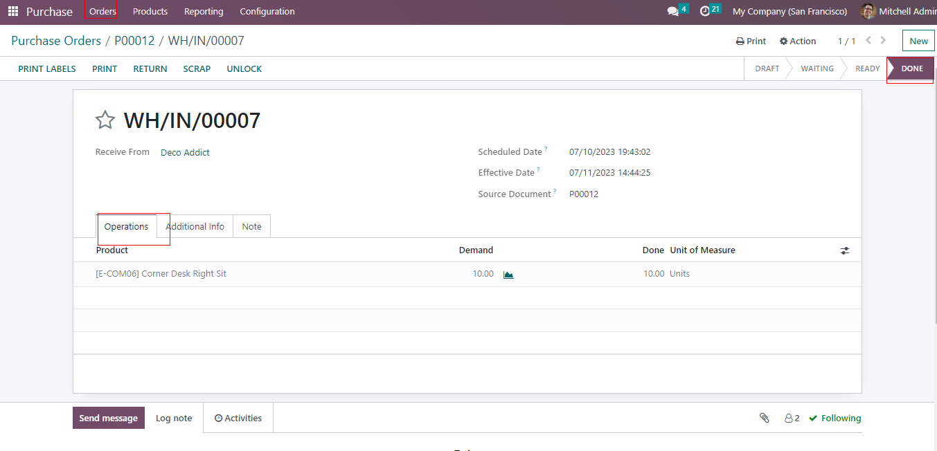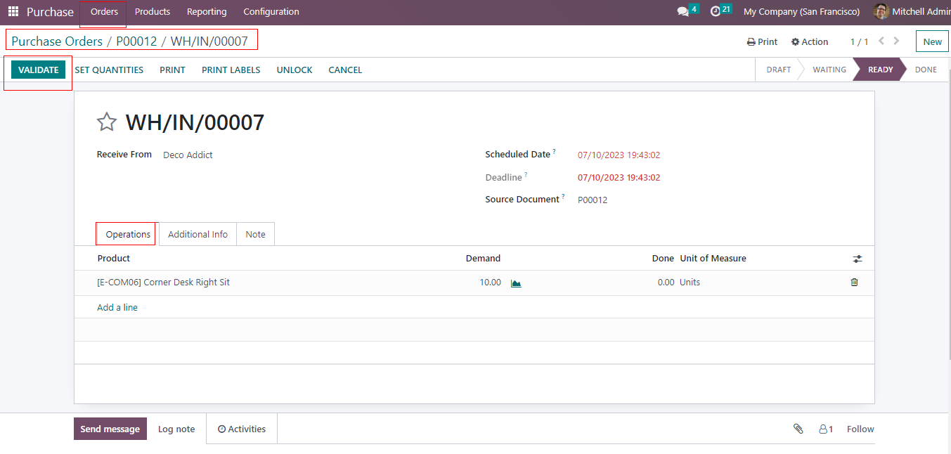 Validate the delivery receipt verifying details like supplier, delivery location, schedule date, and source document.Under the operations tab , view product details, demand , completion status, and unit of measure. The Additional information tab provides shipping and other relevant details.Confirm the delivery by clicking validate. The status changes to Done indicating successful processing of the transfer.