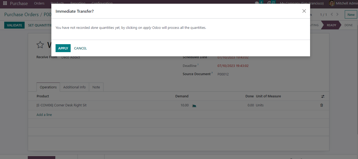 When you click on the Validate Button in Purchase order , a pop-up window will open to allow you to click on the apply button for immediate product transfer.