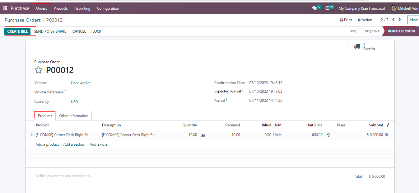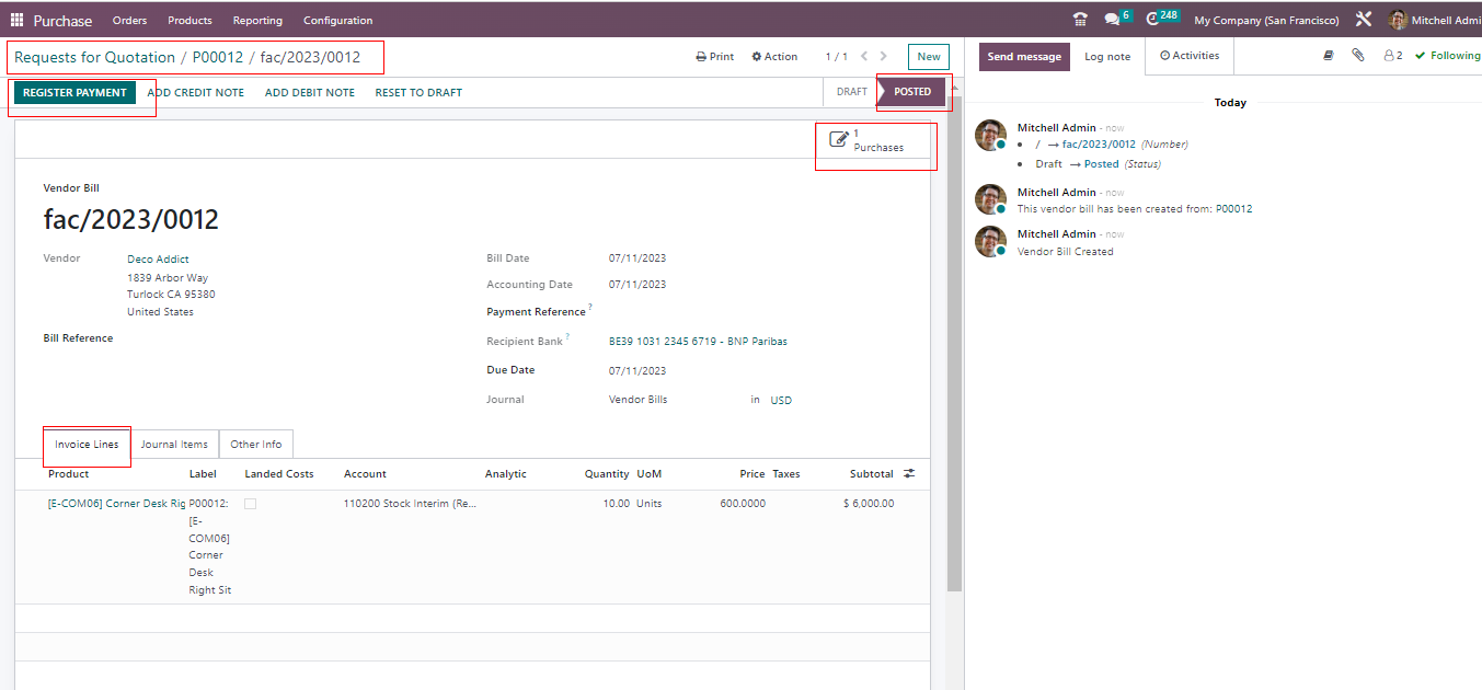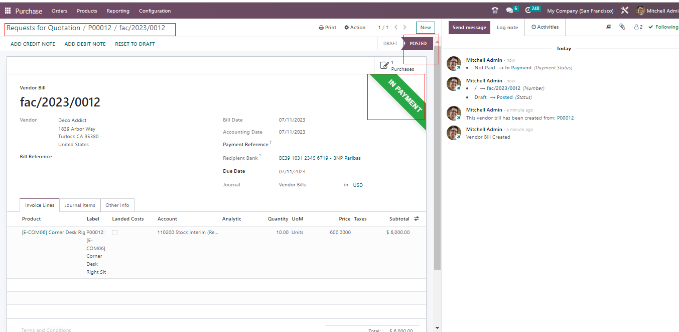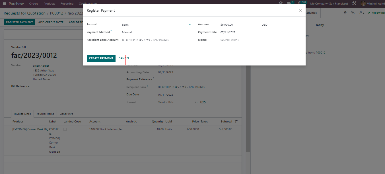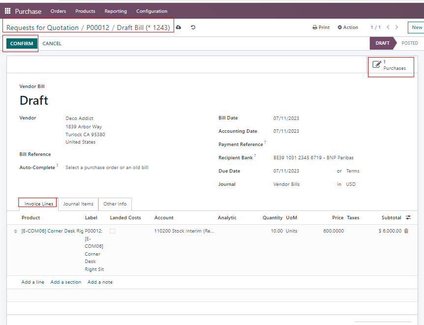 After confirming a purchase order, simply click on the Create Bill button to generate the vendor bill in Odoo. you will be directed to a draft vendor bill from where you can review and verify the details such as vendor information, bill references, dates , payment details, and invoice lines.Confirm the vendor bill by clicking Confirm. Once the payment procedures are completed, the status of the vendor bill changes to Paid , streamlining the payment process for the received products.