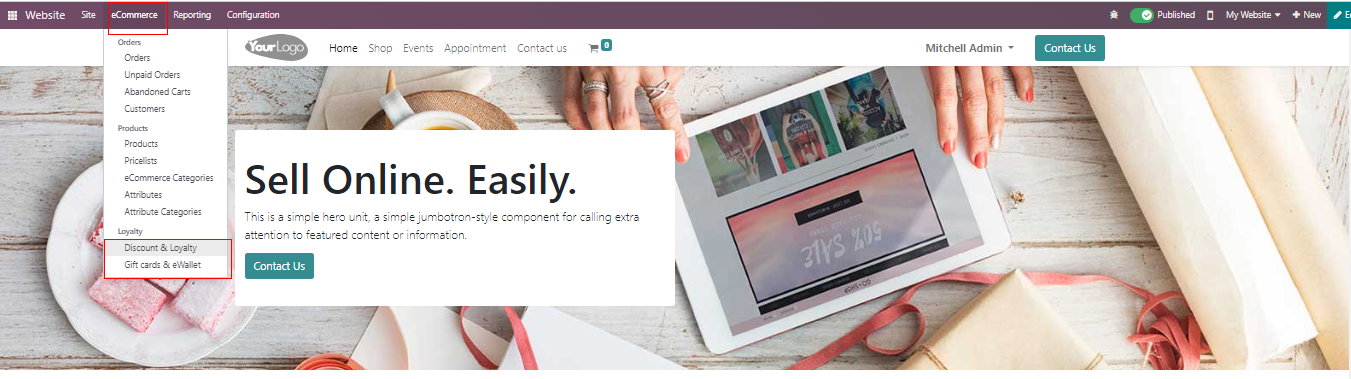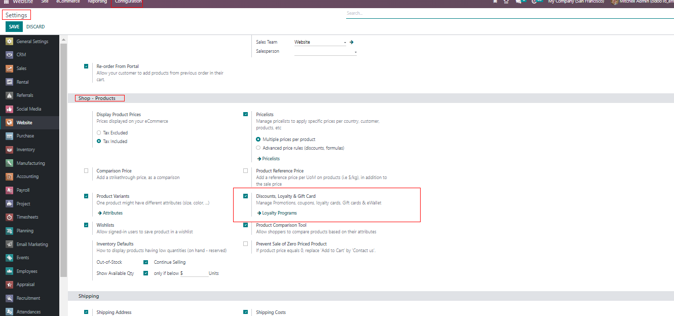 The Odoo system seamlessly integrates Gift cards , Loyalty Cards , and E – Wallets with eCommerce stores, attracting more clients to the business. To access and configure these features, simply navigate to the Configuration tab of the Odoo website module. Within the Settings section , you will find various tabs like Website info, Shop – Payment , Shop – Checkouts Process , Shop – Product , and Shipping.