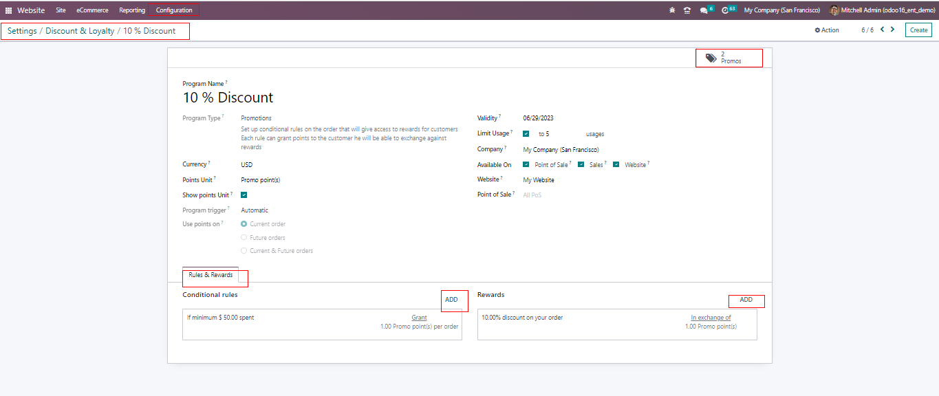 Incorporate your business details in the Company area. Tailor access points for loyalty programs by selecting options such as Point of Sale, Sales , and Website in the Available Options section. By entering the relevant website name in the Website field. You can limit program publishing to specific websites. Additionally , you can restrict program visibility to certain shops by specifying their names in the Point Of Sales area. Following these steps, you can effortlessly set up and manage your discount and loyalty programs in Odoo 16, customizing them to suit your business requirements.
