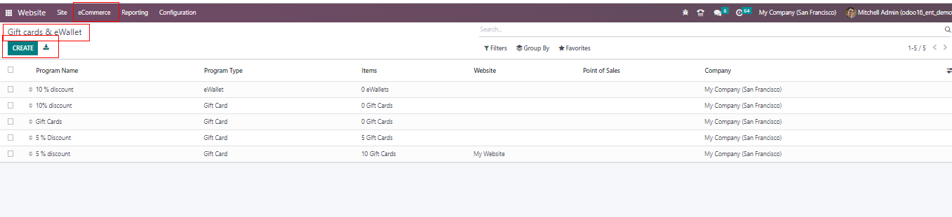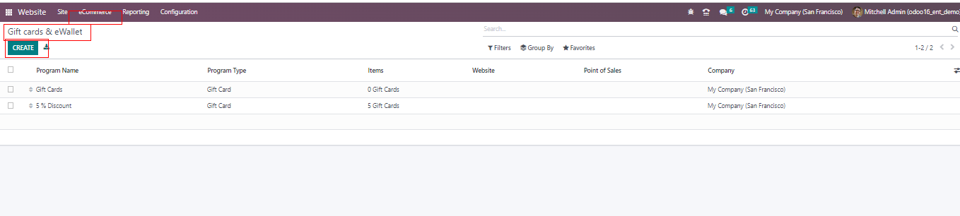 In Odoo 16, a new function is available: a dedicated menu for managing gift cards and eWallets. You can access the eWallet’s functionalities in the new Odoo16 Website module. Go to the “Loyalty” section from the “eCommerce” menu and select the “Gift Cards & eWallets” option. The platform displays a list of gift cards and eWallets together with information about the Program Name, Program Type, Names, Website, Point of sales, and Company, as seen in the image below.