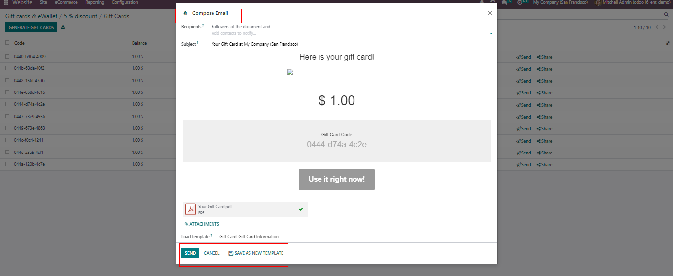 To send the gift cards, administrators can use the “Send” button associated with each gift card field. Clicking this button will open a popup window containing an email body with the gift card details and card code. Admins can edit the email address to ensure the gift card is sent to the correct recipient and then use the “SEND” button to deliver the gift card to the selected contact. This streamlined process enables the seamless distribution of gift cards to customers via email.