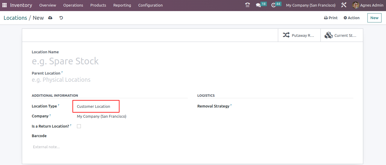 A Company directly owns physical and internal location as a part of its own Warehouse in Odoo.