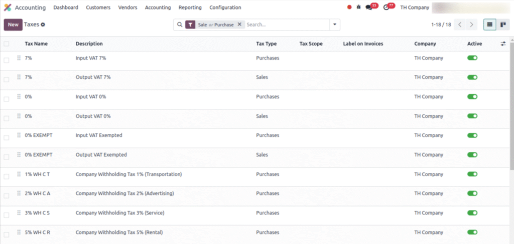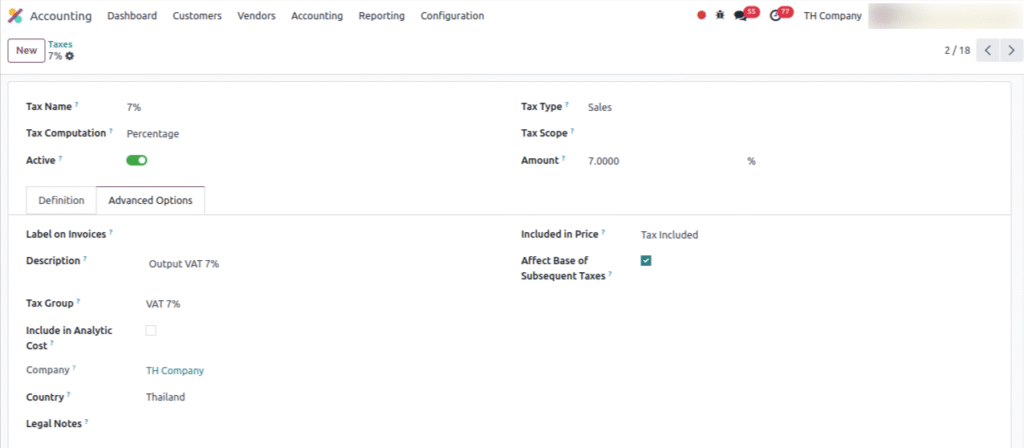 Managing 7% VAT in Odoo is straightforward once set up correctly. Whether you use the preconfigured Thai Localization or prefer a manual setup for advanced control, Odoo ensures automatic calculations, correct PP30 reporting, and compliance with Thai tax laws.