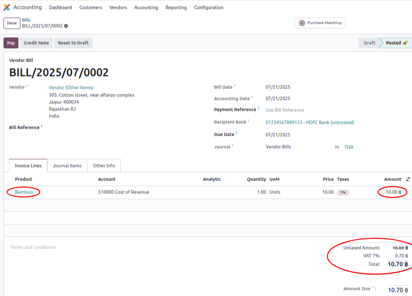 - VAT Amount: 20−18.69=1.31THB20 – 18.69 = 1.31 THB20−18.69=1.31THB