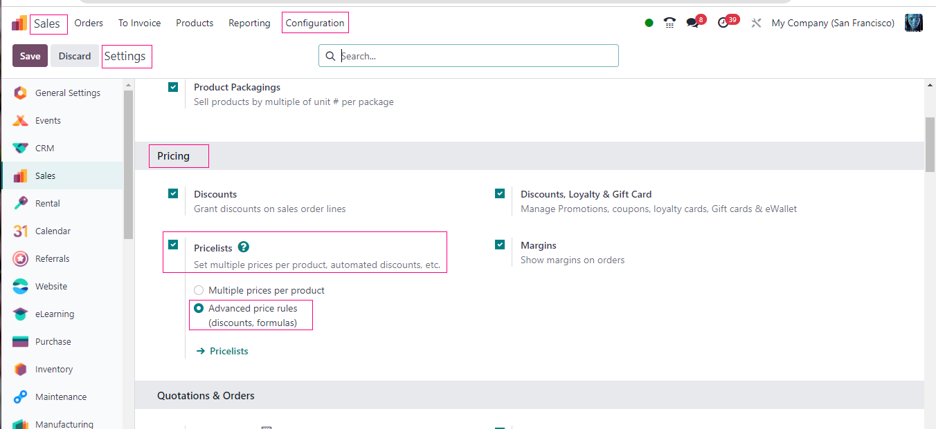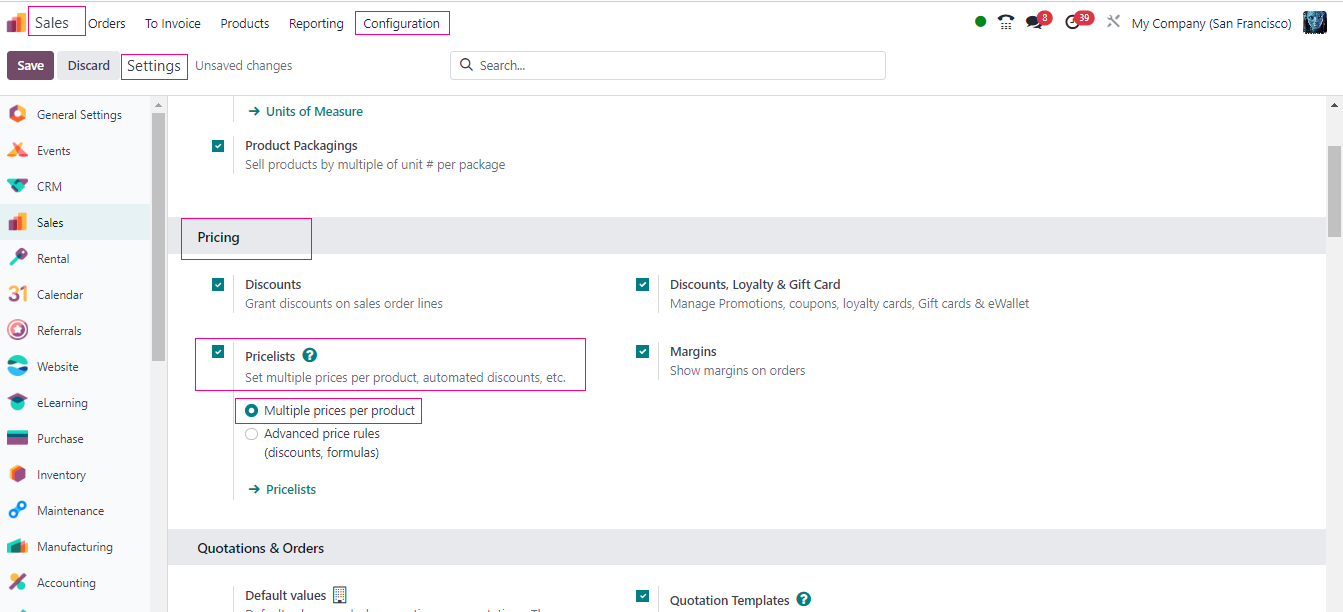 - Look for something called “Pricelists” and turn it on.