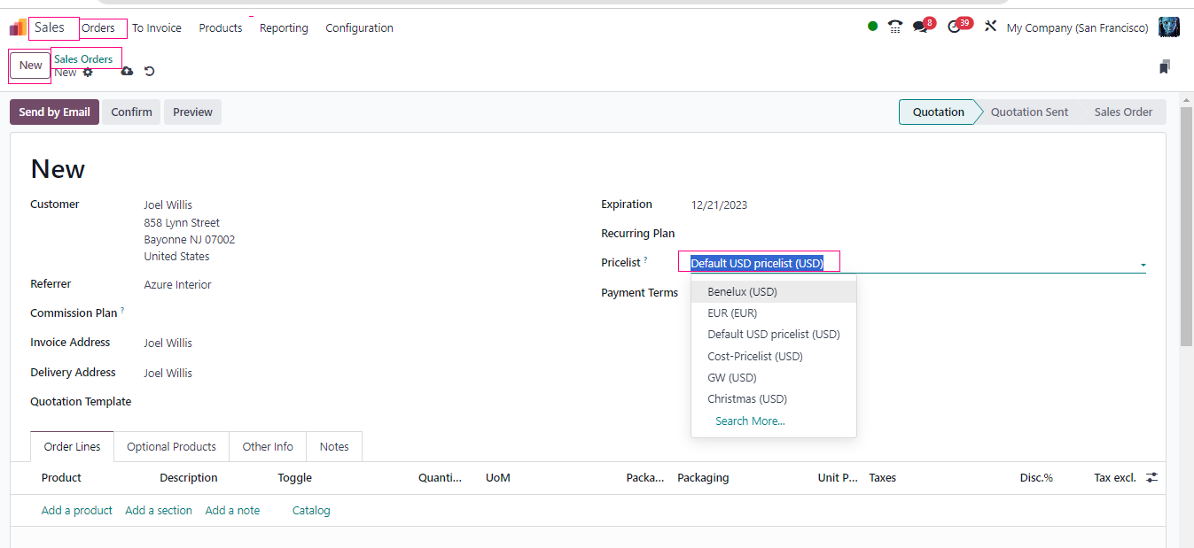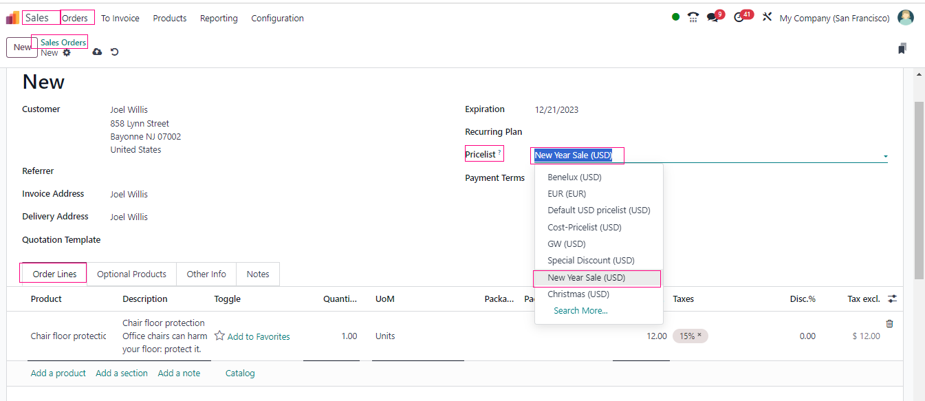 In your sales orders, you can now select the appropriate price list for each customer or situation. The prices for the products will be automatically adjusted based on the chosen pricelist.