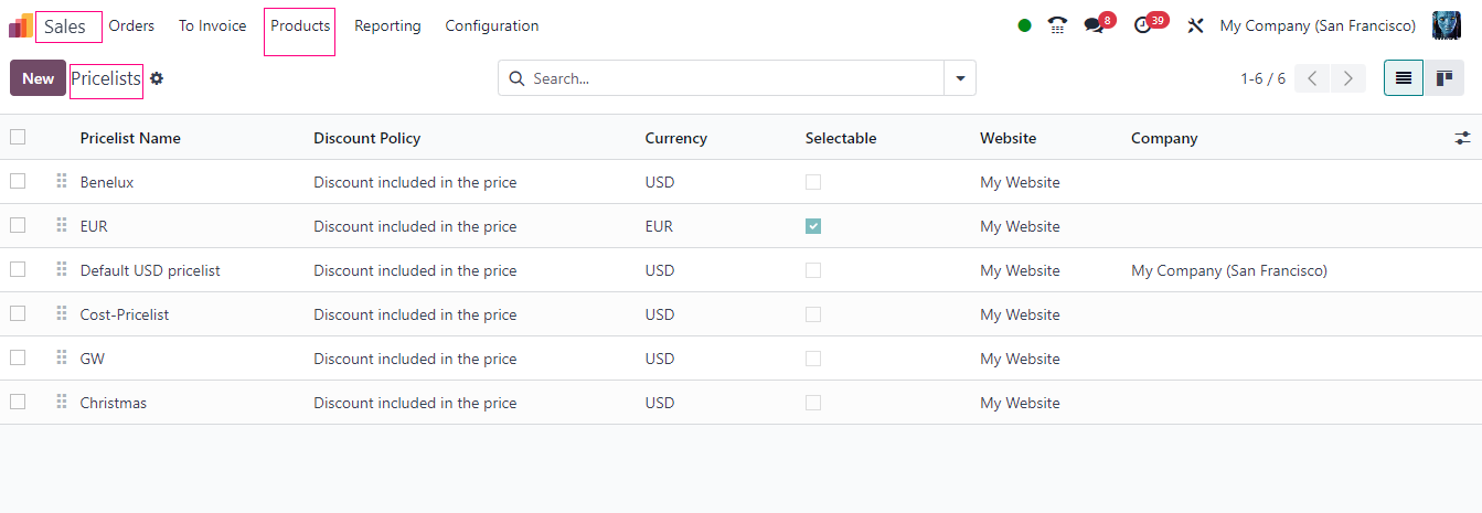 In Odoo, go to the Products menu.Look for an option called Pricelists and click on it.