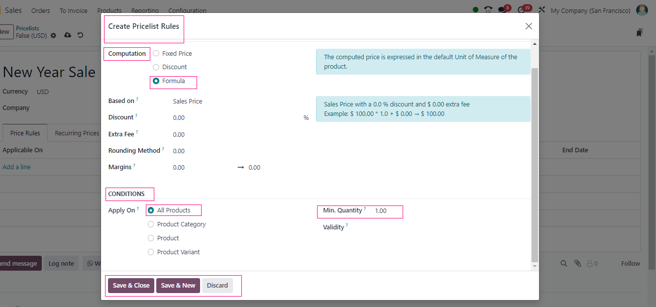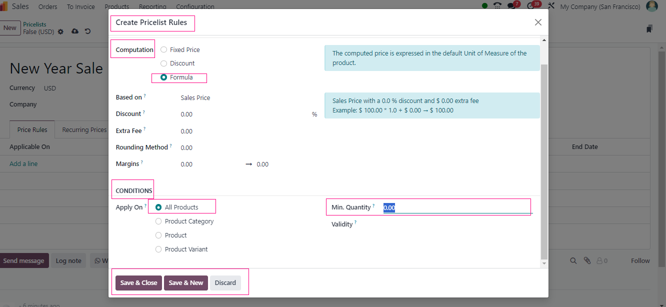 When you’re creating a new pricelist, there’s a cool option called Formula that lets you calculate prices with, well, formulas. If you’re into making sure your prices stay within a certain range, you can set minimum and maximum margins.