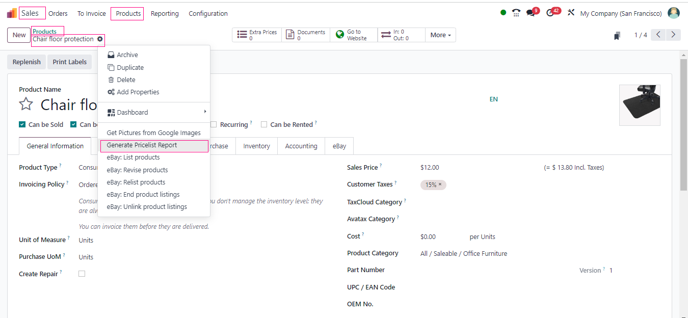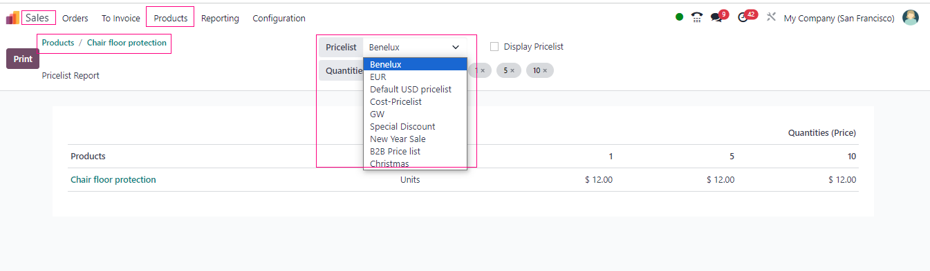- With the power of the Action button, go ahead and generate that pricelist report for the specific product.
