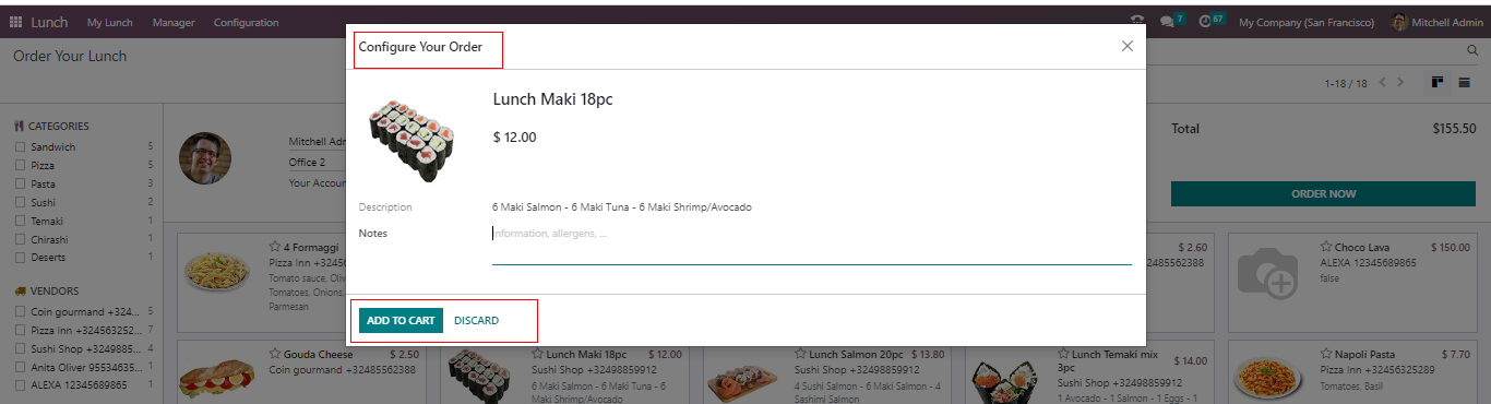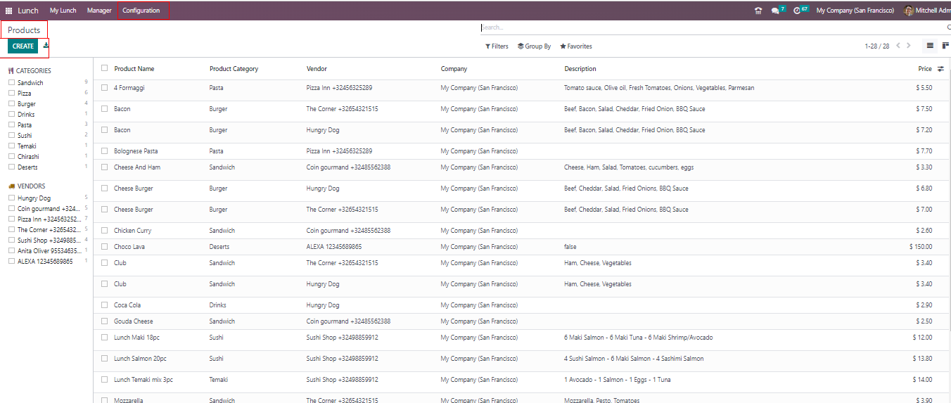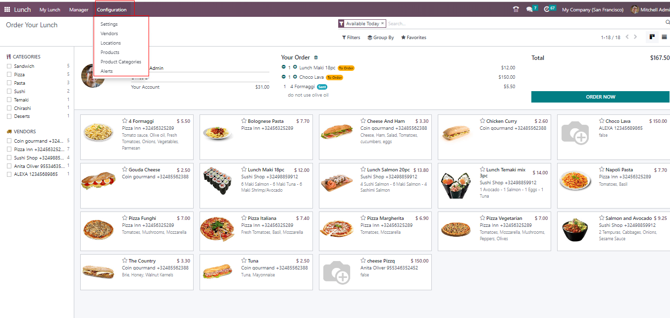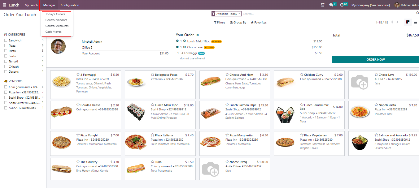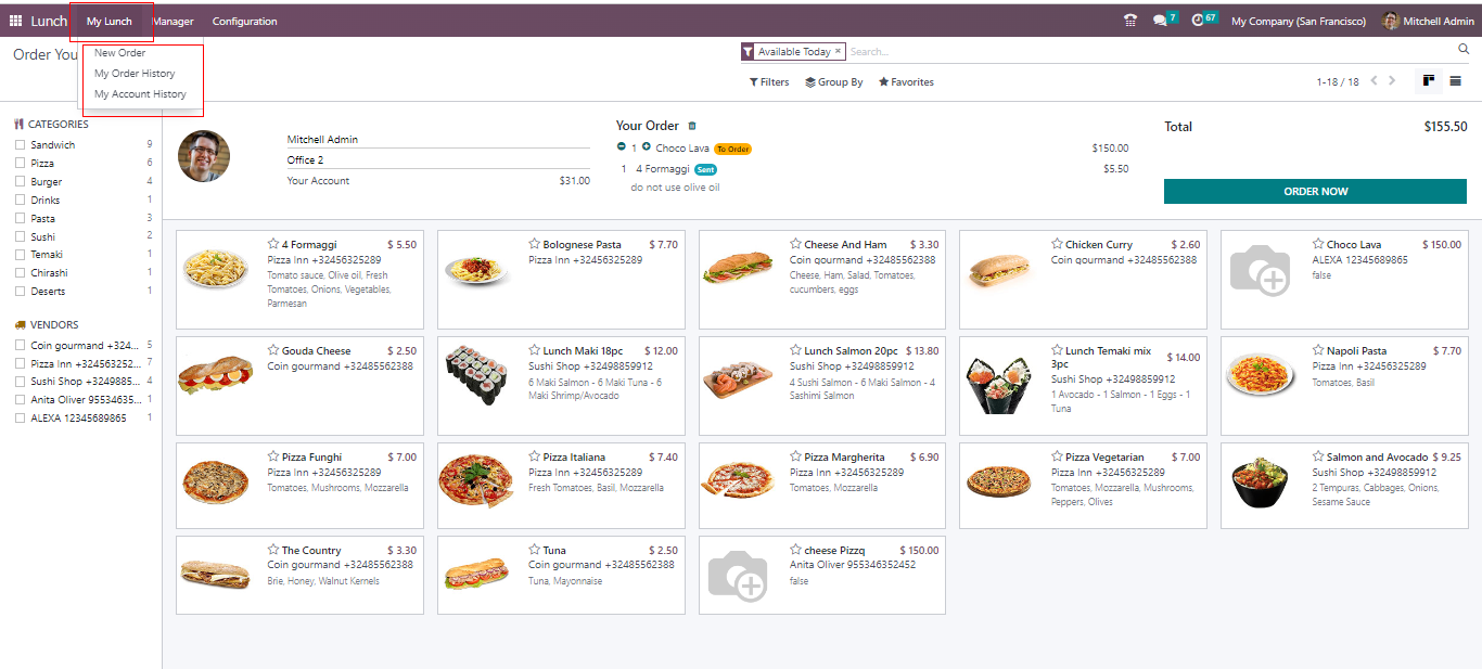 The module ensures individualization by displaying each employee’s profile on the lunch dashboard. Vital details such as the employee’s name , office address , and account balance are included in this profile. This account balance is used for placing lunch orders. Employees can effortlessly place their meal orders by clicking on the Kanban cards representing the available food items. Additionally , the system provides options for categorizing products and filtering choices based on vendors, enriching the ordering experience.