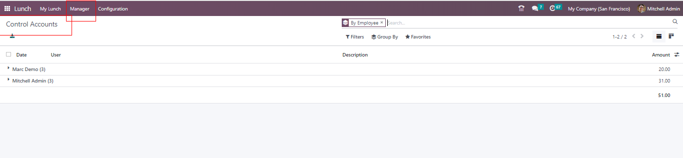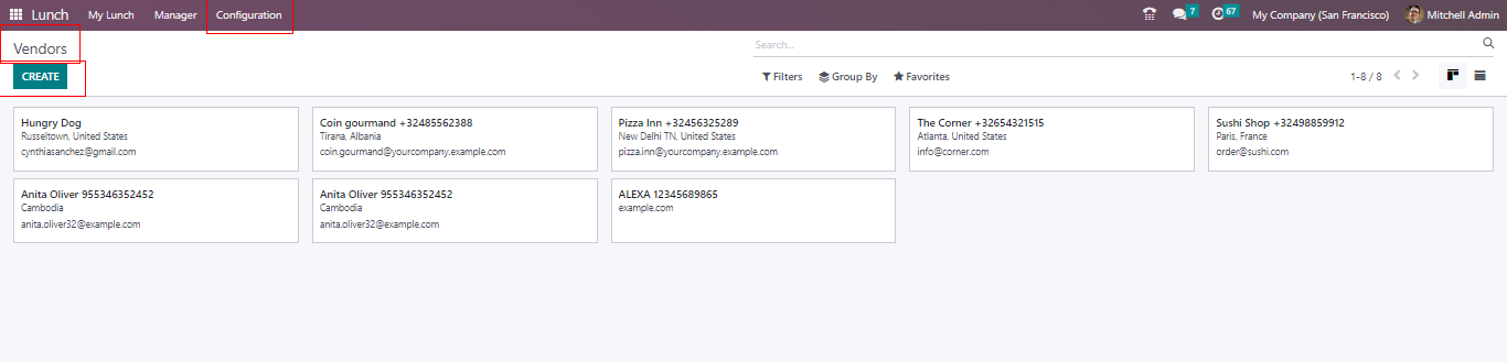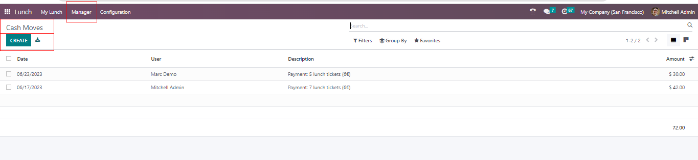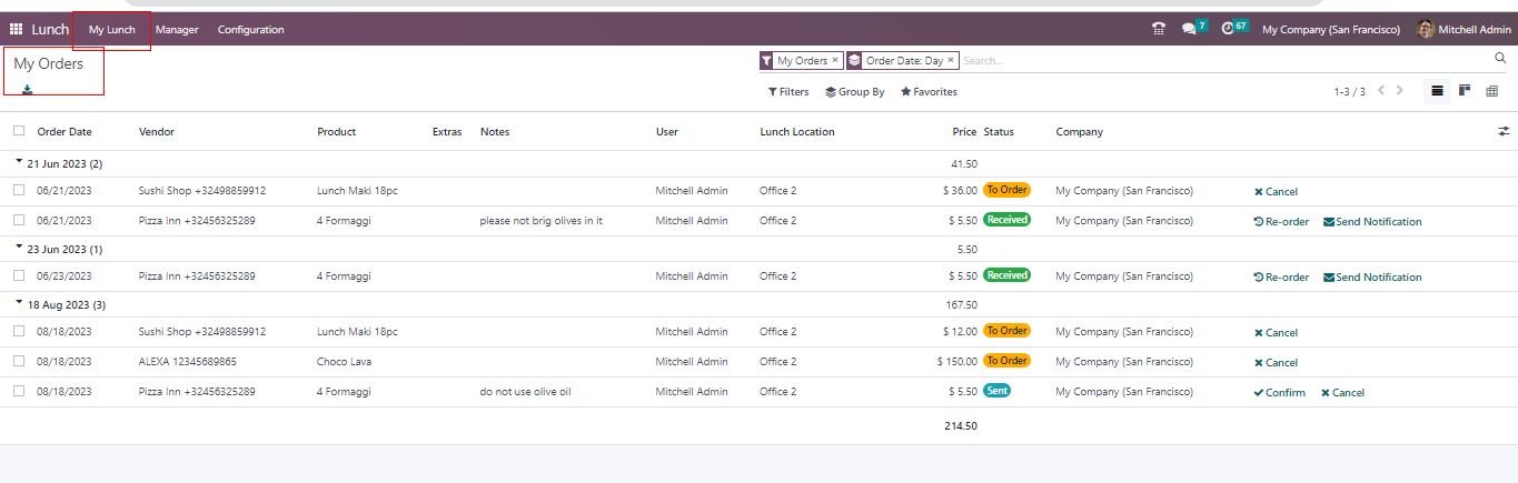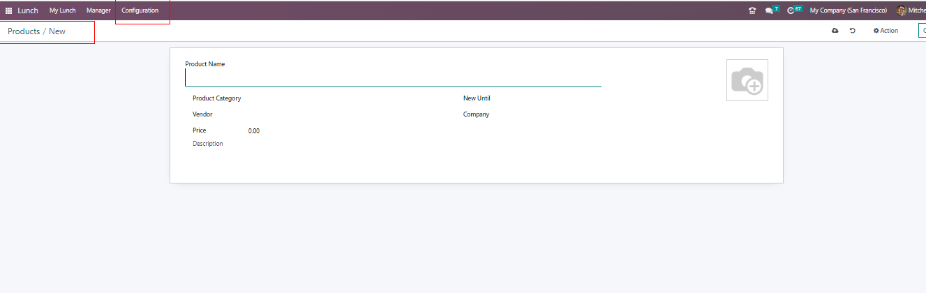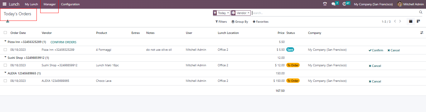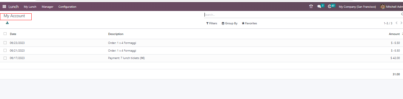 The module ensures individualization by displaying each employee’s profile on the lunch dashboard. Vital details such as the employee’s name , office address , and account balance are included in this profile. This account balance is used for placing lunch orders. Employees can effortlessly place their meal orders by clicking on the Kanban cards representing the available food items. Additionally , the system provides options for categorizing products and filtering choices based on vendors, enriching the ordering experience.