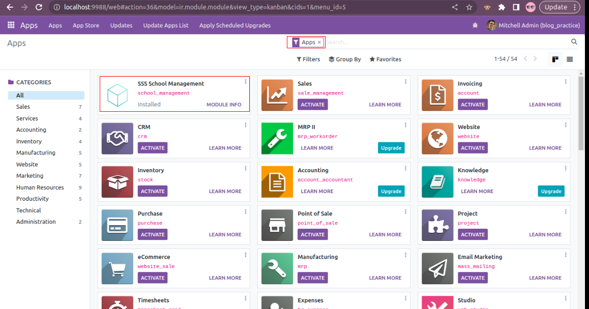 By mentioning the above details in the __manifest__.py file, our module will be visible in the Odoo App list as below.