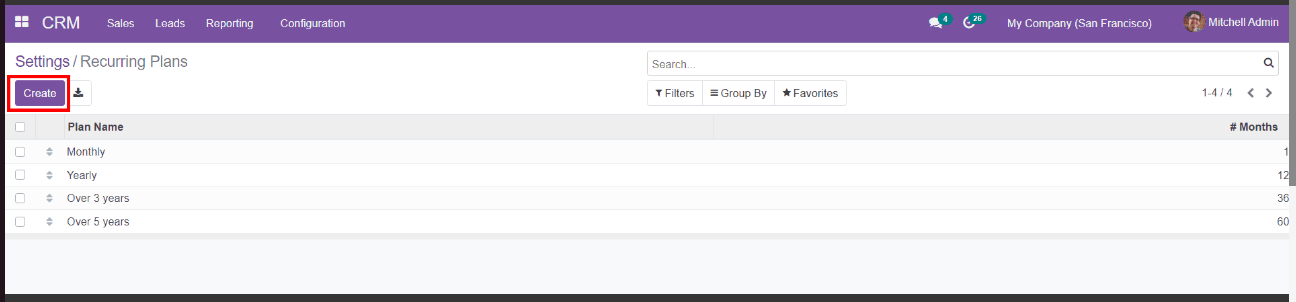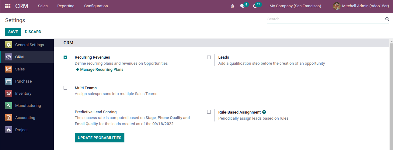 You can manage the Recurring Revenue by clicking on the ‘Manage Recurring plans ‘ to Recurring Revenue option or else you can also find the ‘Recurring plans ‘ field in the configuration menu of the CRM.