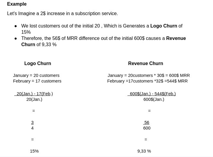 - Revenue Churn – it corresponds to the monthly Recurring Revenue loss rate.