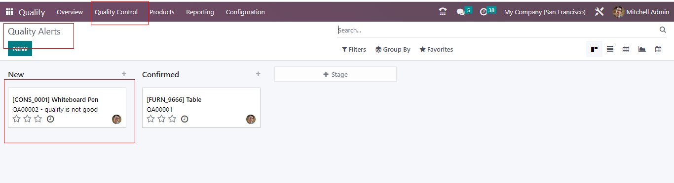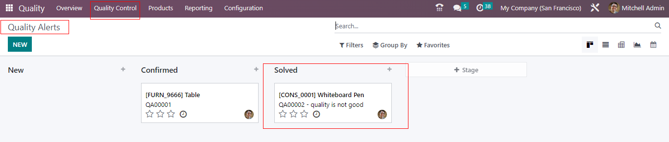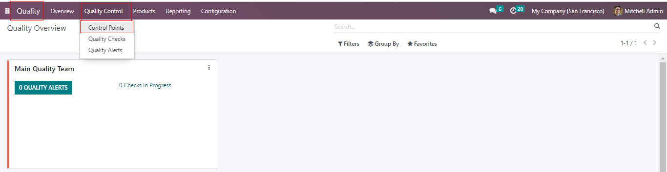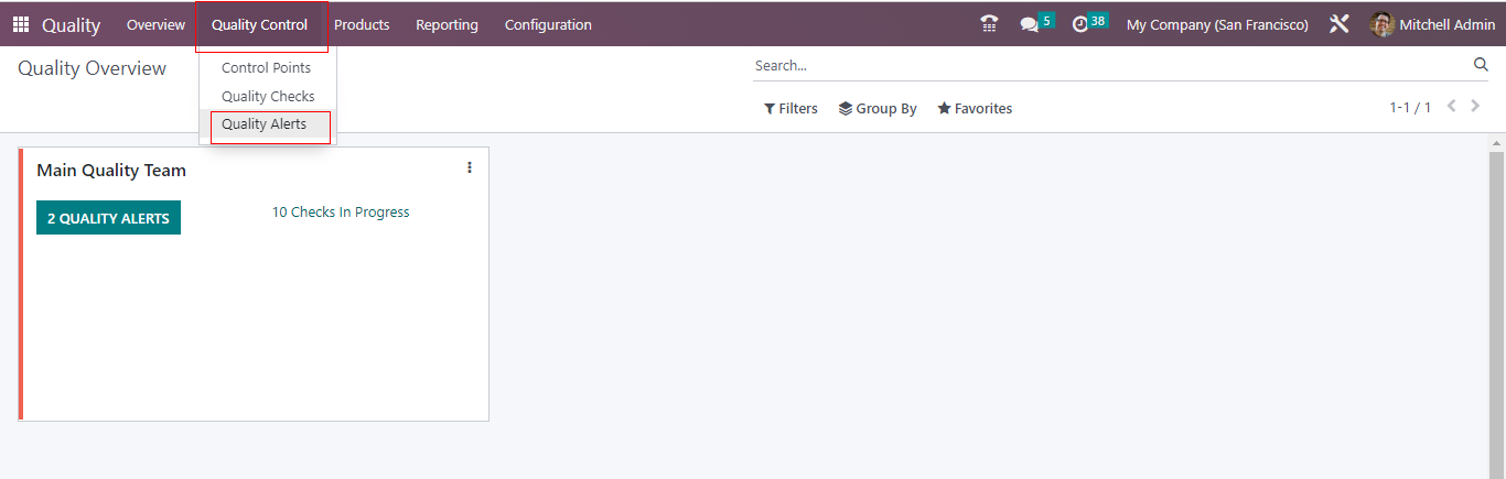 Now, let’s navigate back to the Quality module. Within the Quality module, you’ll find the “Quality Control” tab, which includes sections for “Control Points,” “Quality Checks,” and “Quality Alerts.” Select “Quality Alerts” from this tab.
