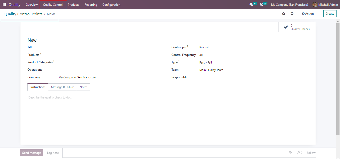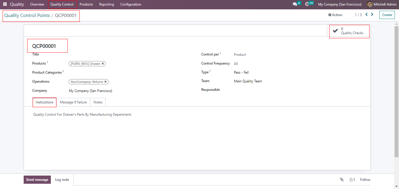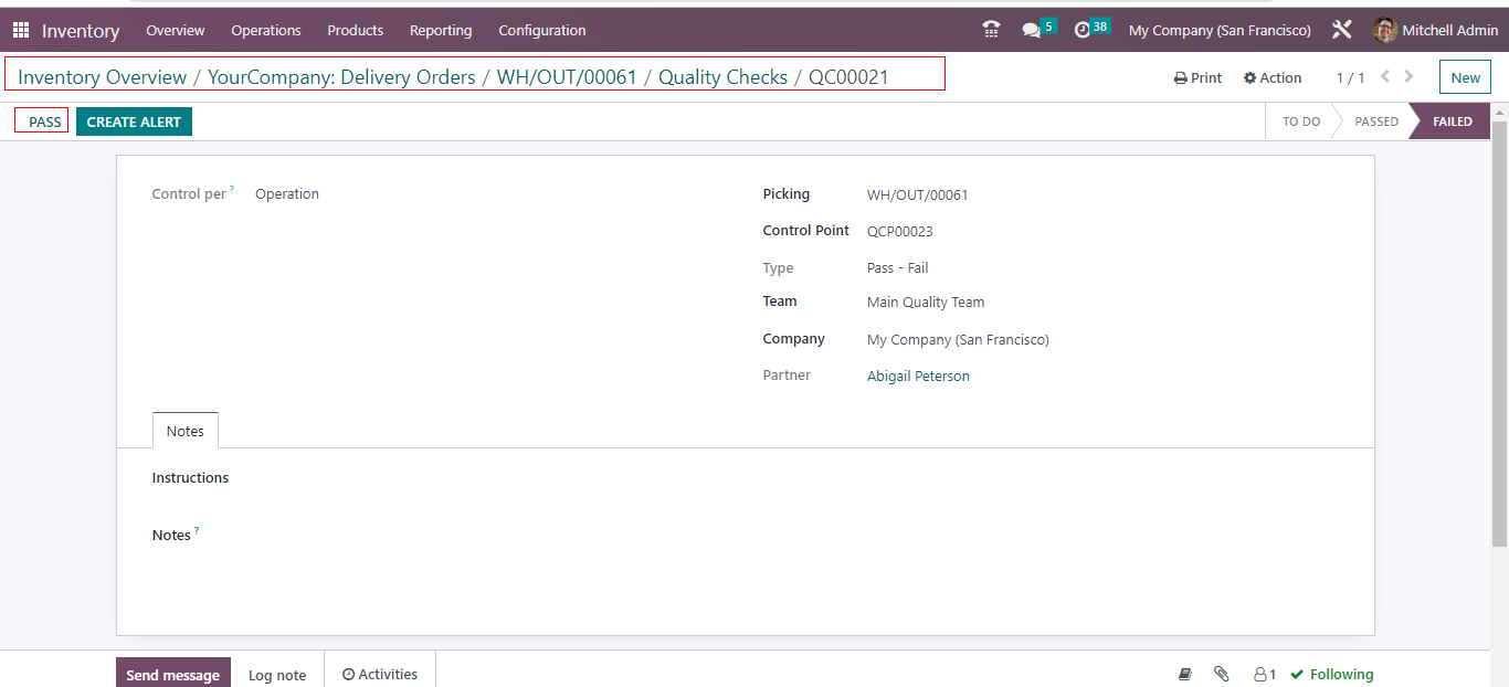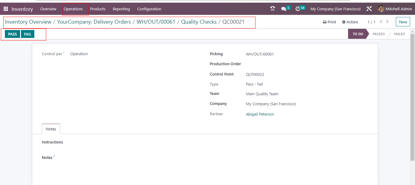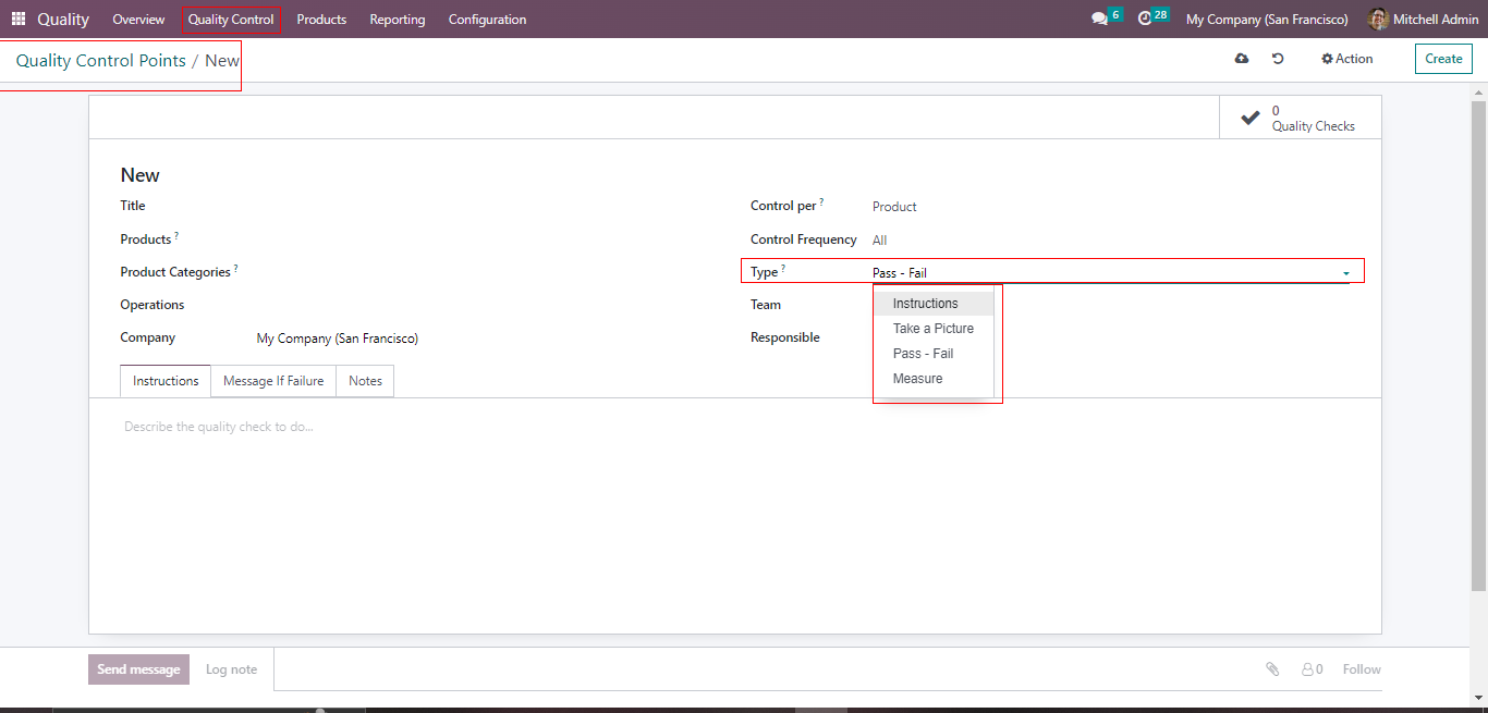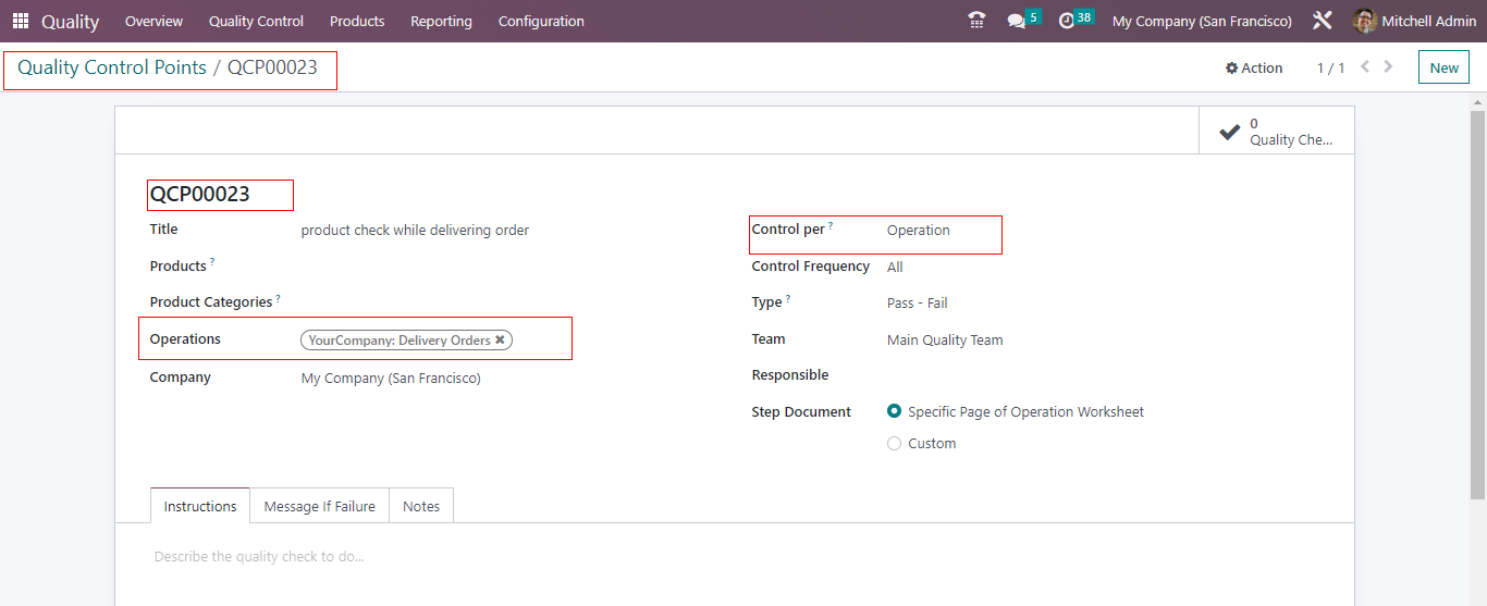 This new control point is titled Quality check while delivering product. And is set to operate per Operation. The specific operation designed for quality checks is Delivery , and the quality check type chosen is Pass – Fail.