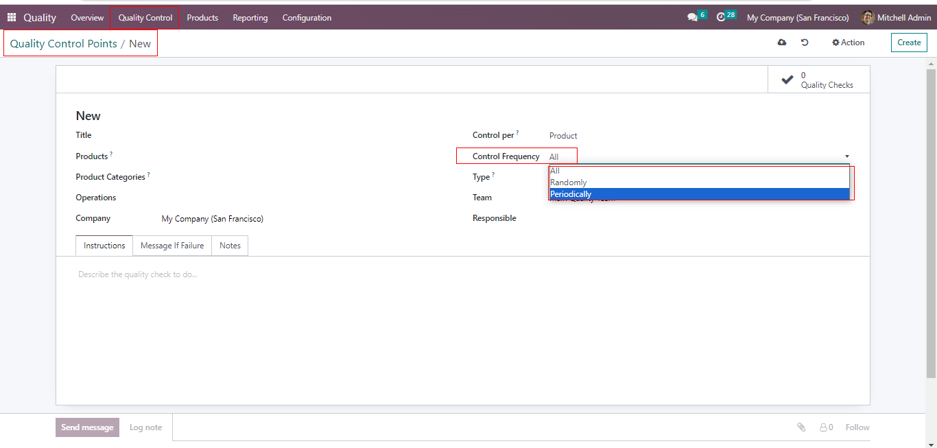 A Control Per Product approach is selected with a Control Frequency set to All . In this case , the chosen quality type is Instruction , allowing you to input specific instructions in the designated tab. After configuring these settings, remember to save the control point.