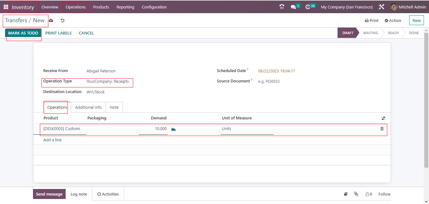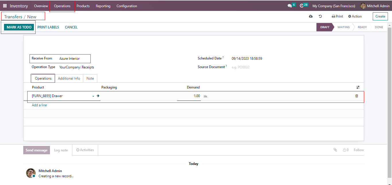 Next , click on the New button. For the transfer you are creating , let’s say that a customer named Azure Interior wants to return one unit of the product Drawer . This returned product is then placed in the company’s stock location. To initiate the transfer , simply click on the Mark As TODO button.