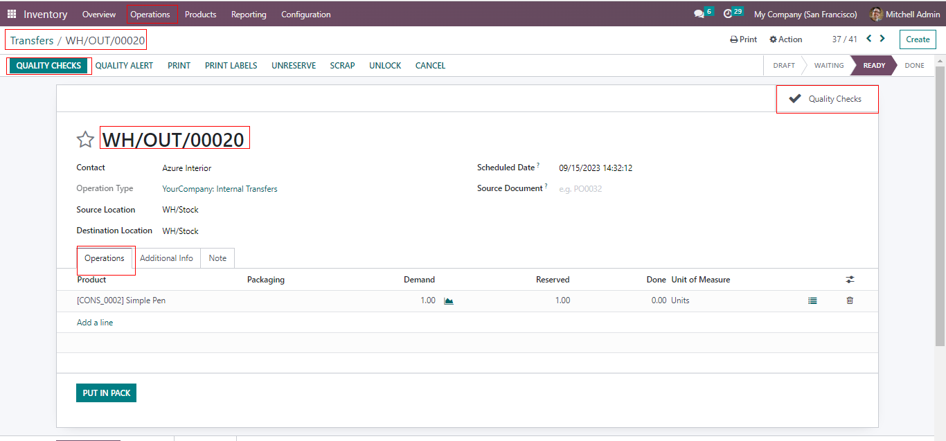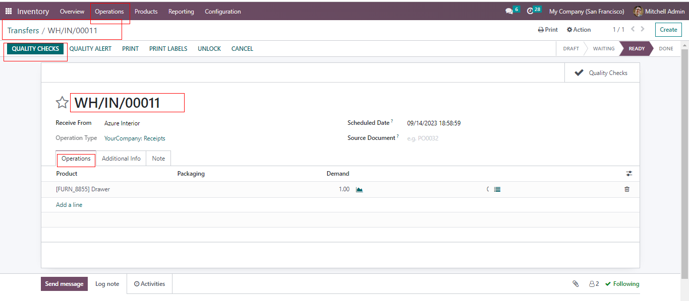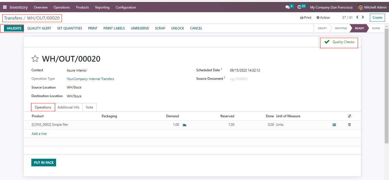 The transfer process proceeds directly from the Draft stage to the Ready stage without stopping at the waiting stage. This skip occurs because the stock location already has the required quantity of the product. At this point , a new button labeled Quality Checks will appear , indicating the presence of a control point that requires quality checks.
