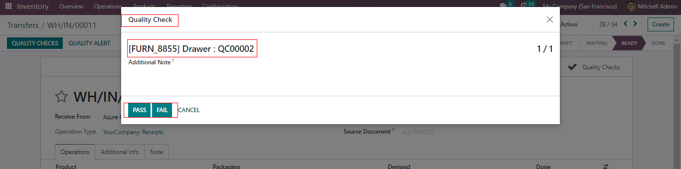 Within the popup window , you will perform the quality check. In this case , the quality checking type is Pass or Fail of the product at this stage.