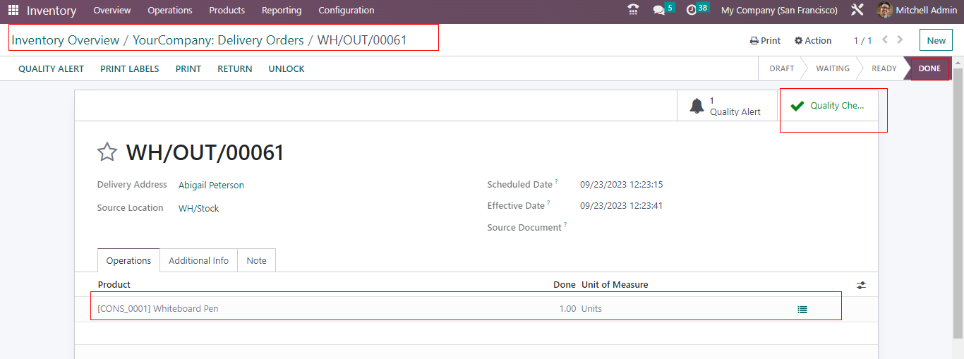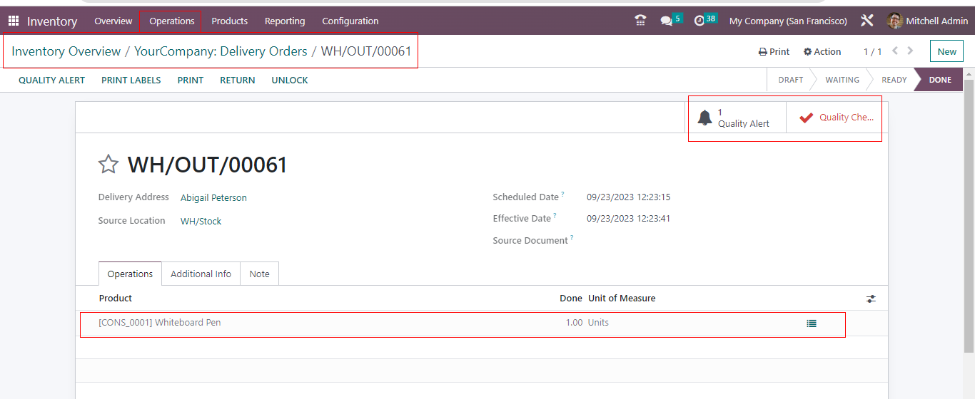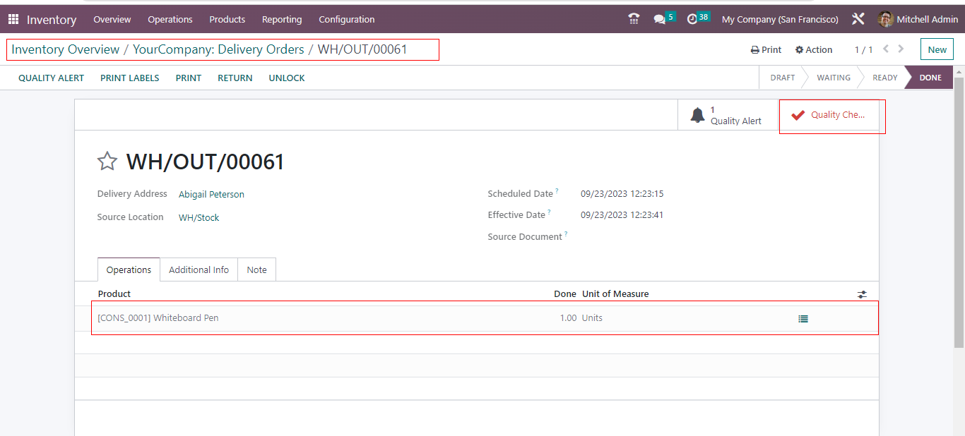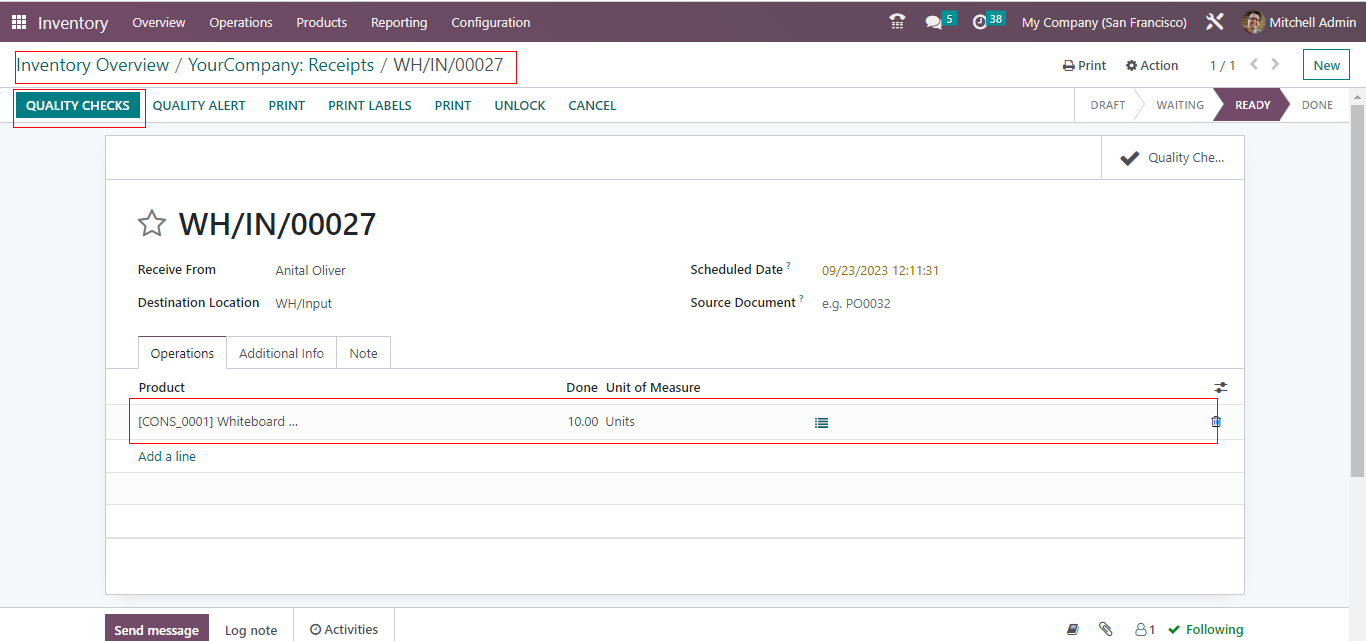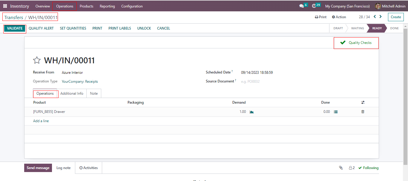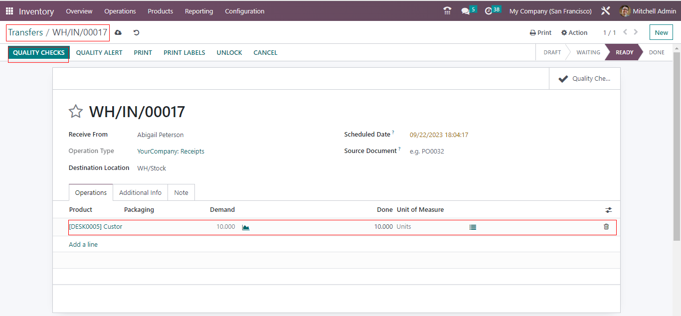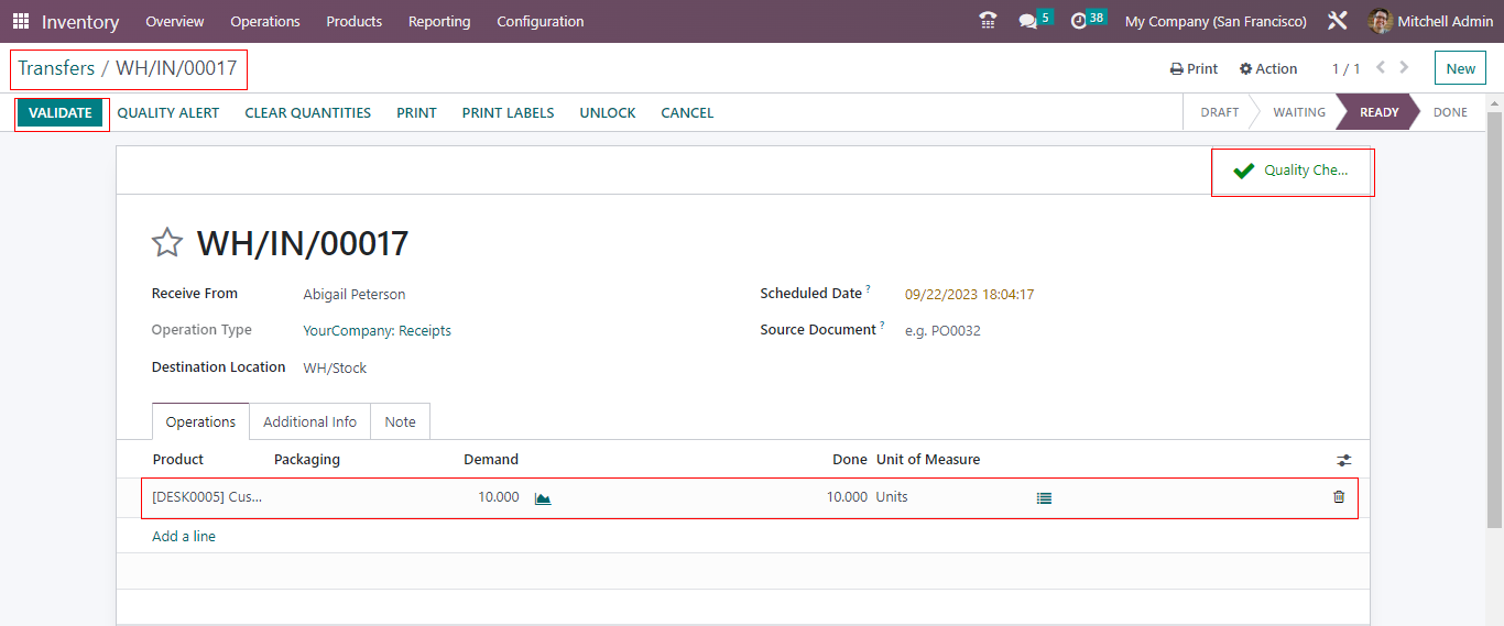 Next, initiate a delivery operation through the Inventory Transfer process. In this case, the customer is Deco Addict, and the selected product is the “Large Desk.” As previously mentioned, click on “MARK AS TODO” to begin the operation. Subsequently, the “QUALITY CHECKS” button will become accessible.