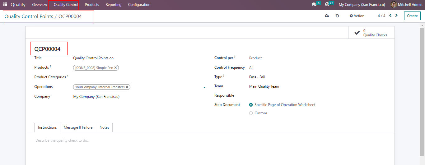 Now, Consider the Control Per Product approach. Here , quality checks are tied to specific products and operations. For example , a new Quality Control Point has been established for the product Simple Pen with the title Quality Control Point on established for the product Simple Pen with the title Quality Control Point on Simple Pen. Within this point , the chosen operation is Internal Transfer . This signifies that when an Internal Transfer is initiated for the mandatory quality checks specific to that product have been successfully conducted.