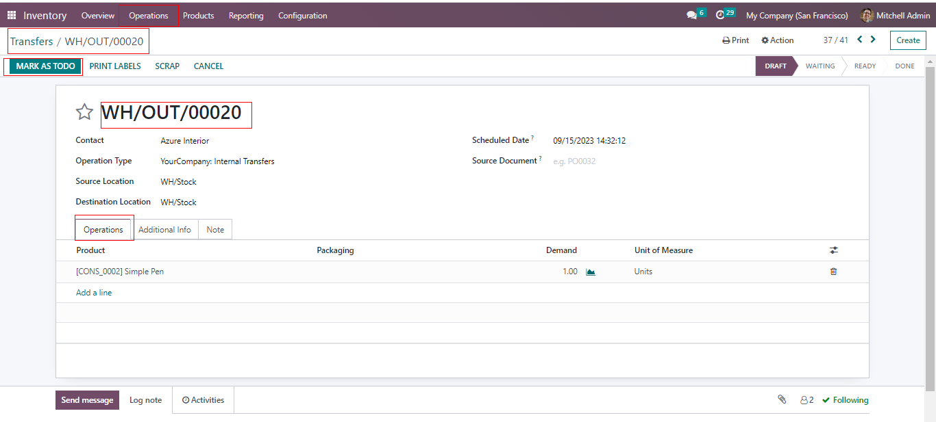 In the internal transfer process you are setting up, the product is to be moved from the Stock location to This operation is categorized as an Internal Transfer. You will specify that you want to move two quantities of Simple pen within the Operation tab. To initiate the transfer , simply click on the Mark As TODO button.