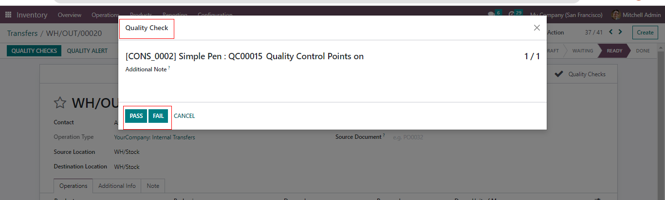 Click on the Quality Checks button to initiate the product quality assessment. A popup window will appear , displaying the same title that was provided when creating the Quality Control Point. You will also see the instructions within this window. Additionally , there is an option for the user to include any extra notes related to the quality check. Once everything is in order, click the pass button to confirm the quality check.