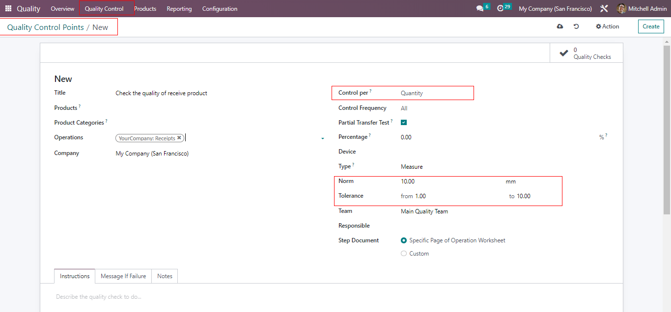 For instance , a control point has been established for the operation Receipt , and it is configured as Control Per Quantity. In this scenario , every single quantity of the received items must undergo quality checks.