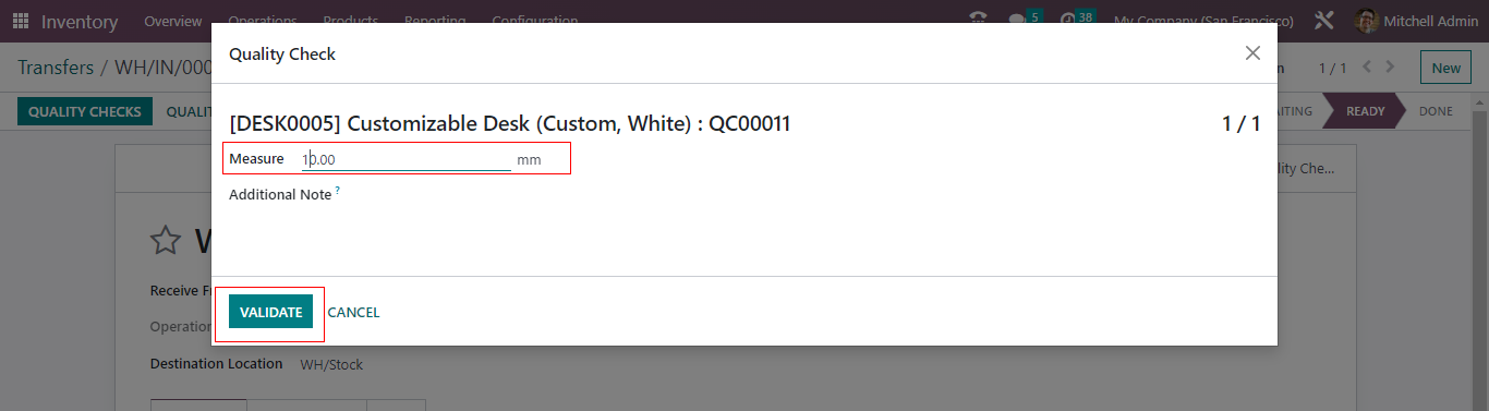 Once you have made these selections , click on the Mark As TODO button. The 10 quantities of Customizable Desk is now in the process. To proceed , click on the Quality Checks button.