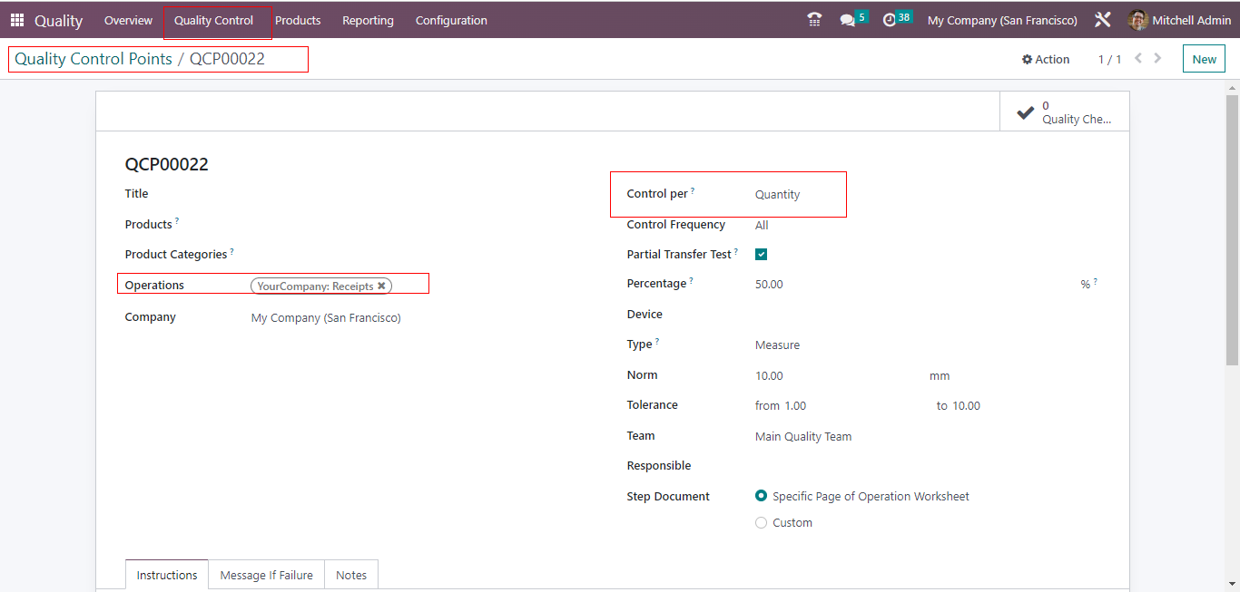 When Control Per Quantity is selected , an additional option becomes available : Partial Transfer Test. If this option is disabled , it means that every individual quantity of received goods must undergo quality checks.