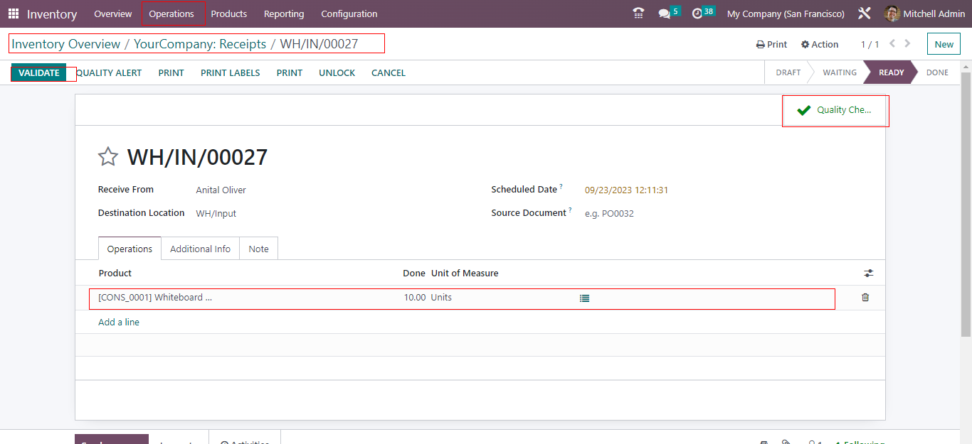 Now , let’s recreate the same receipt process. Choose Anita oliver as the vendor and select abc quantities of the product Whiteboard pen .