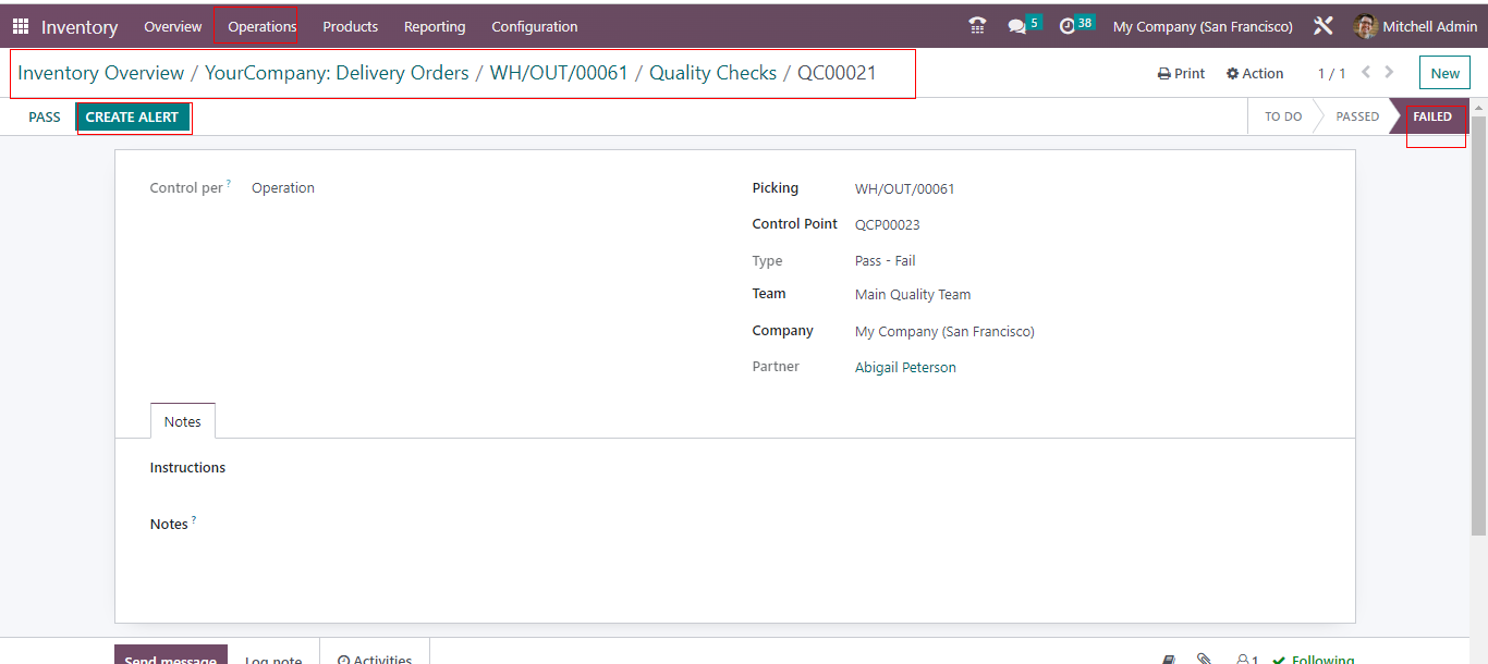 In this situation, the “Quality Checks” smart tab appears in red, indicating that the quality checks have failed. From this tab, the user has the option to create a Quality Alert.