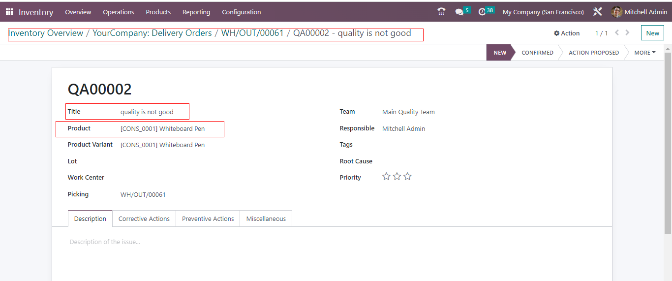 Inside the quality alert, you can specify a title for the alert and select the relevant product. The delivery sequence number is automatically added in the picking field. In the “Root Cause” field, you can choose the reason for the quality check failure. Additionally, you have the opportunity to provide details for “Corrective Action” and “Preventive Action” in their respective tabs. Once all the necessary information is added, the alert can be created to initiate the resolution process.