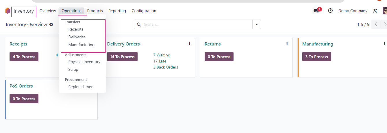 Odoo 17 refines the menu structure by introducing separate categories for various operation types, providing a more organized and accessible inventory management experience.