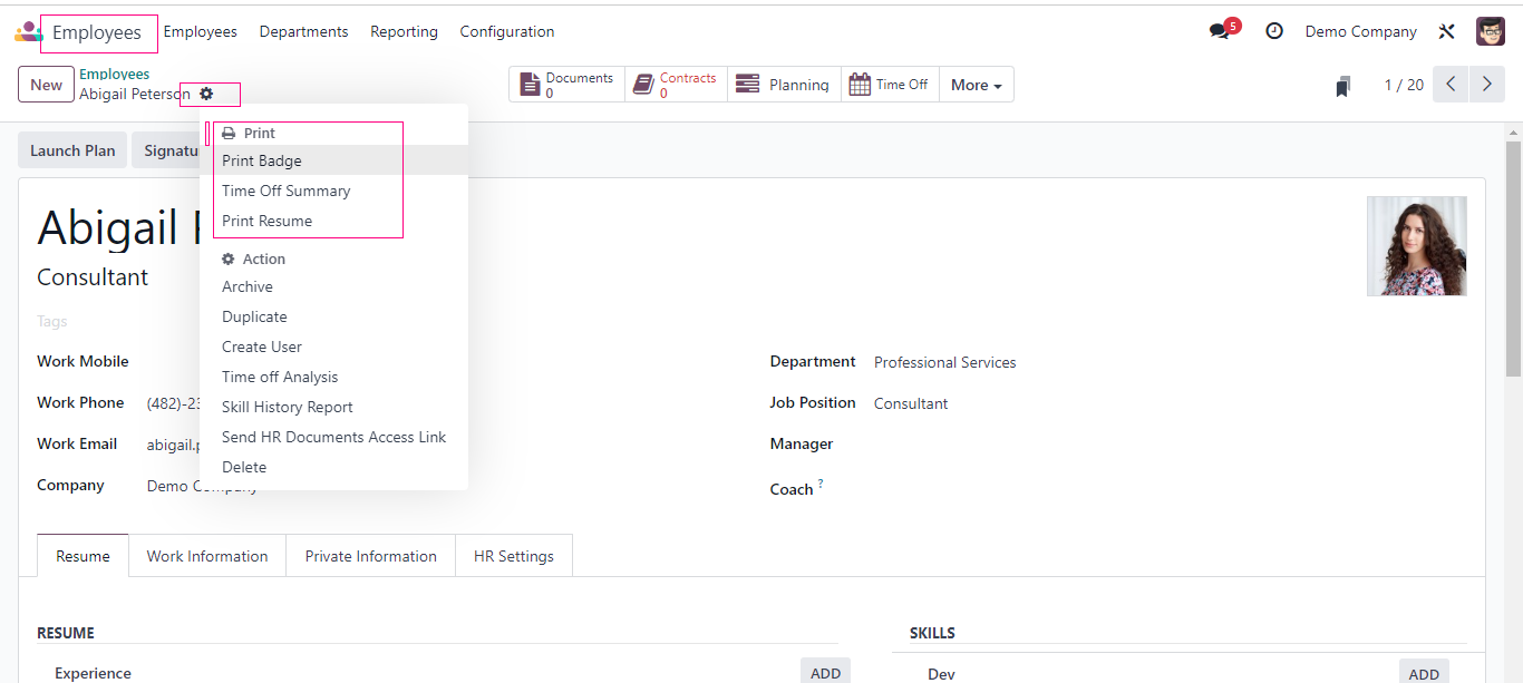 Odoo 17 introduces the ability to generate and print employee resumes directly on the platform , streamlining HR processes.