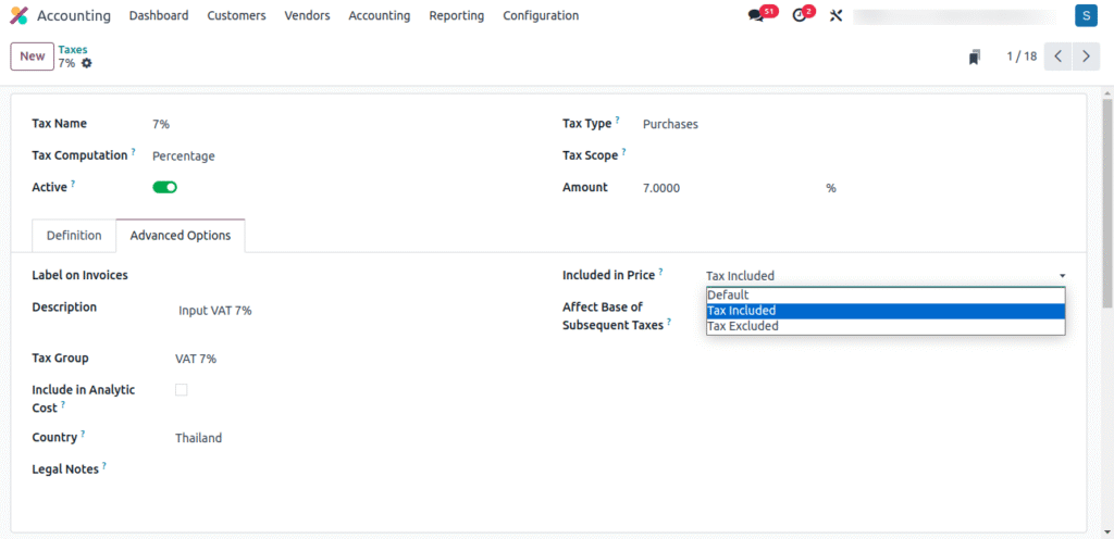 The integration of Thai localization (l10n_th) within Odoo provides preconfigured tax templates and a standard Thai Chart of Accounts (CoA), enabling businesses to manage VAT with minimal manual intervention.